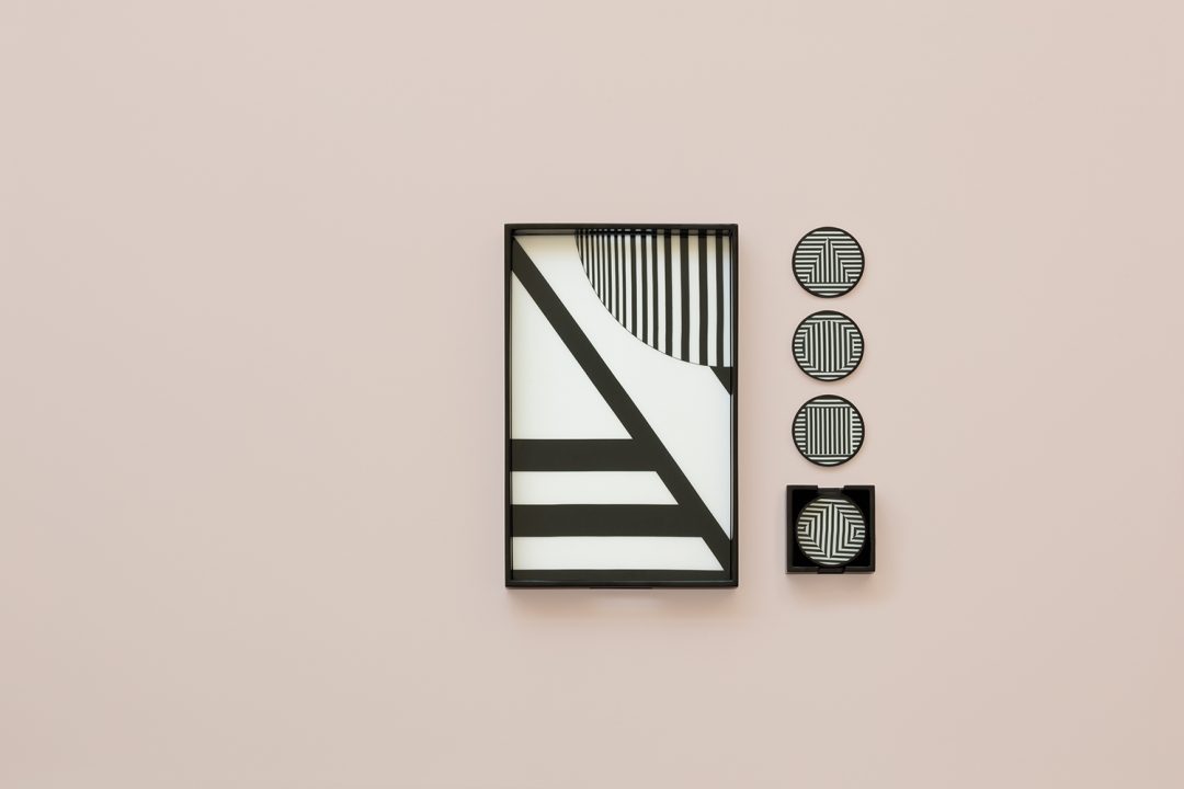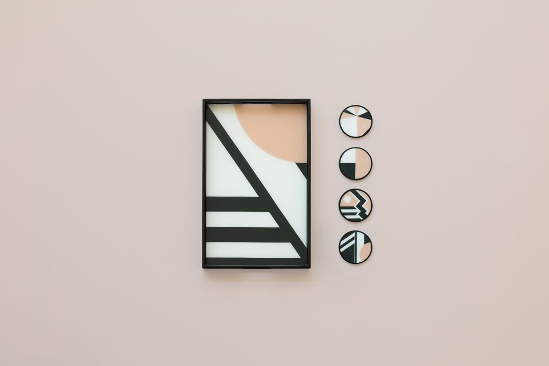 Les lignes, les motifs et les couleurs s’entrechoquent et se répondent avec style. Le rose poudré vient maitriser le bleu électrique cernés de noir qui affirme le graphisme des lignes. Aussi fonctionnels qu’esthétiques, les plateaux et les sous-verres de Kelly Behun ne sont pas sans nous rappeler également le mouvement Memphis.