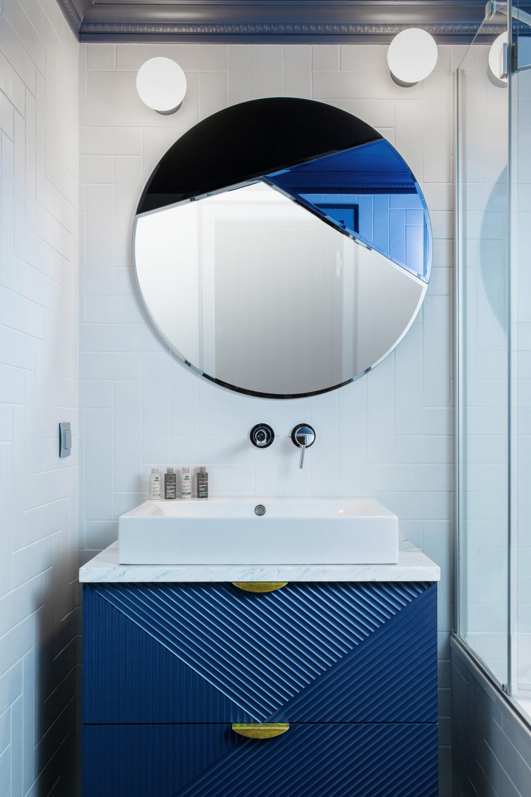 Salle de bain : Meuble sur mesure réalisé par l’agence, calepinage de bois laqué Esprit «shabby» chic. Poignée laiton. Miroir 100% graphique salle de bain Reflections by Hugau Larsson.