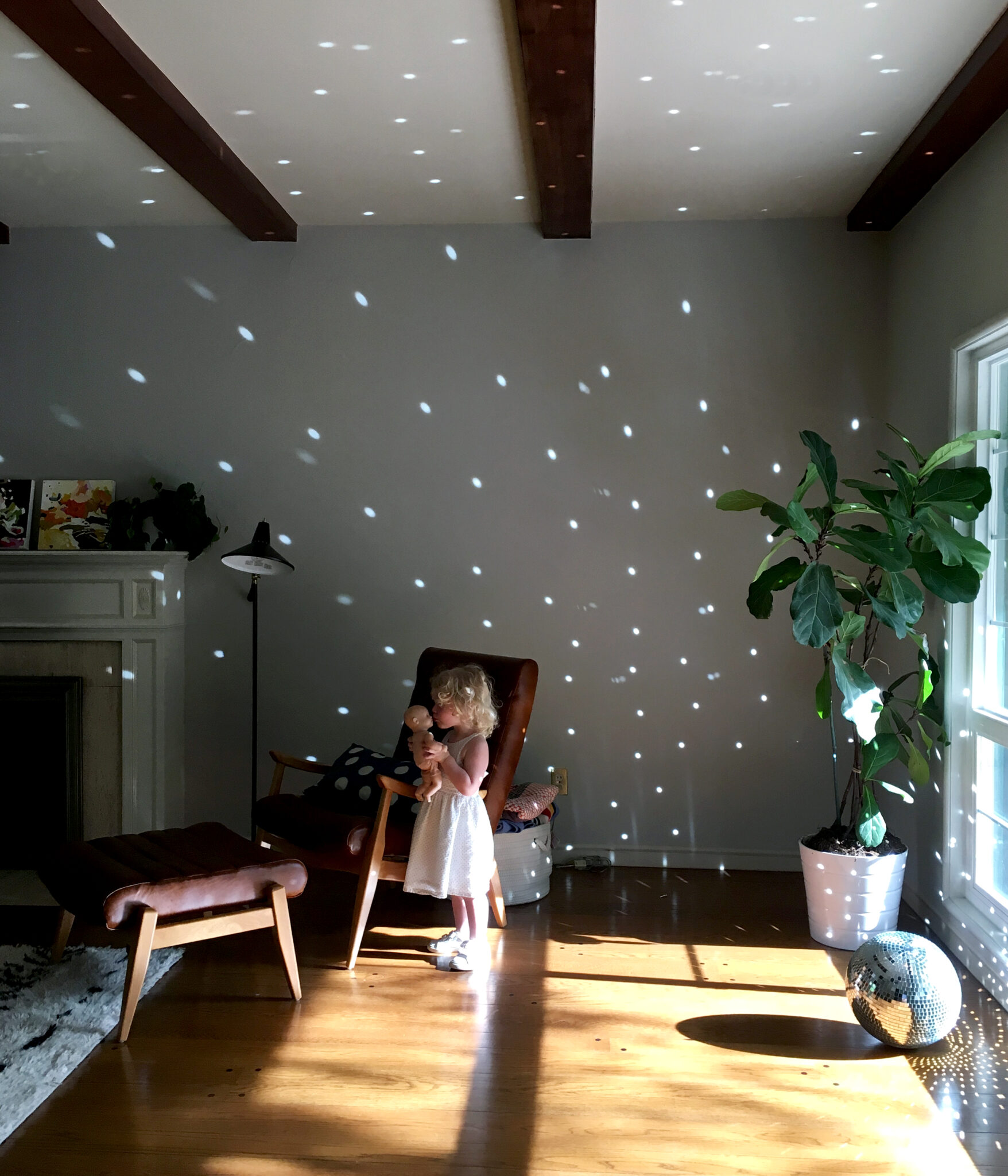 Ah oui non avant, faut que je vous dise pourquoi la boule à facette, où avais-je la tête. Parce qu’aujourd’hui plus que jamais on a besoin de se faire du bien et que la lumière est le premier ingrédient à avoir se fabuleux pouvoir. Et qu’est-ce que ça donne quand la boule a facette rencontre la lumière, qui plus ai la lumière naturelle ? Et bien c’est juste magique.