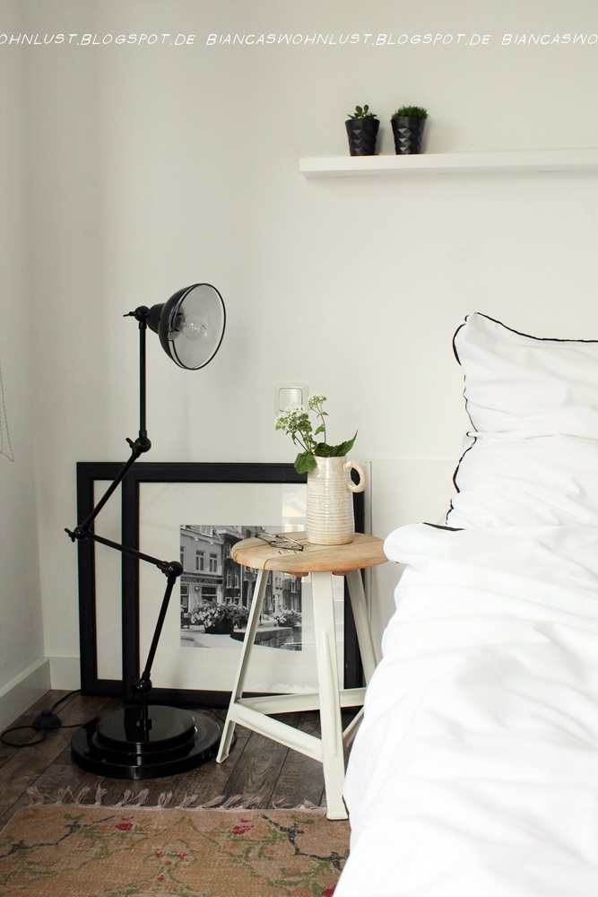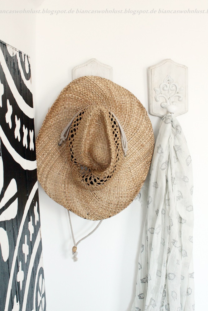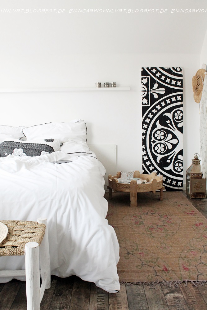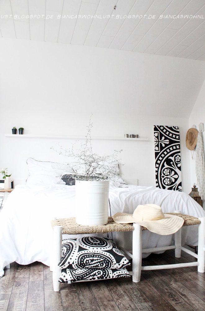 Bianca a misé sur la simplicité et cela fonctionne à merveille. Les murs et le plafond ont été peints en blanc. La noir et blanc est ici adoucit par la présence de matières naturelles comme le bois et ce banc en cordes tressés.