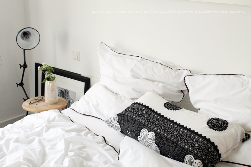 Les objets posés au sol accentuent la simplicité et évitent une surcharge visuel. Cela donne également un petit côté bohème et désinvolte à cette décoration, qui pourtant semble avoir été pensé dans les moindre détails. Ici rien n’est poussé à l’extrême et on touche juste du bout des doigts les influences pour ne jamais y tomber complètement. Pour preuve le linge de lit orné d’un discret liseré noir qui donne un côté très distingué à cet univers…