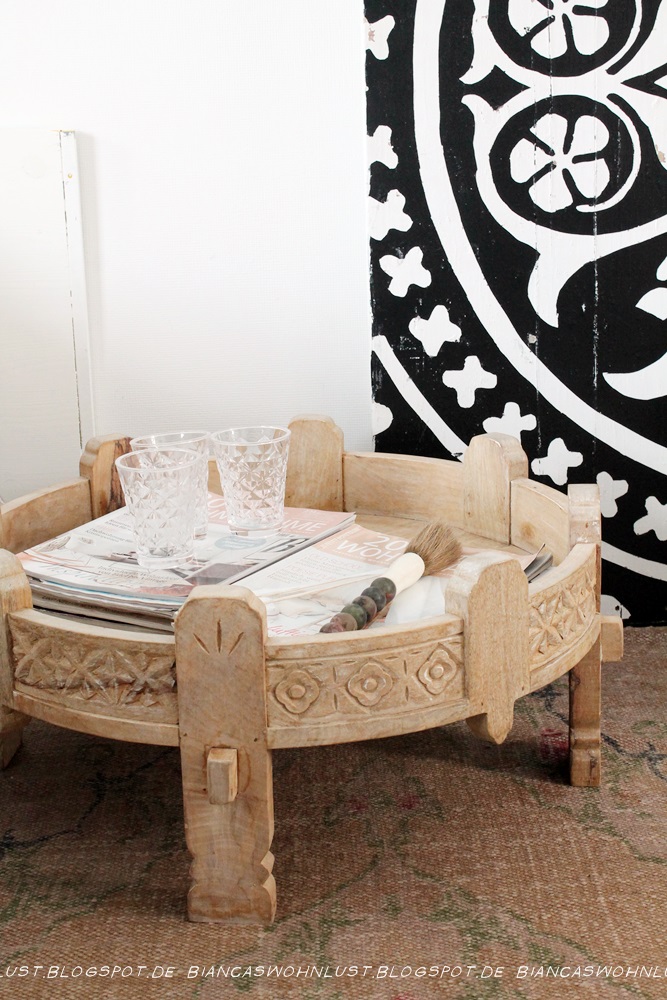 Le motif des textiles n’est pas sans rappeler celui de la planche que Bianca a fabriqué et les accessoires déco délicatement disposés créent une unité parfaite et délicate.