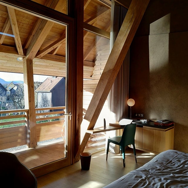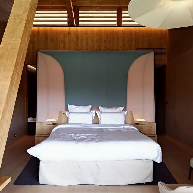 Les détails de la chambre sont dingues. Pour poser le décor, il faut savoir que cette suite fait 40m². Le lit et son étonnante tête de lit en tissu de la célèbre maison Bisson Bruneel en sont le centre. Ils délimitent ainsi les différents espaces que sont l’entrée, le dressing, la salle de bain et la chambre en elle-même. Le bureau en simple planche de chêne donne sur la terrasse qui surplombe la piscine et un charmant jardin bucolique. Le cadre à gauche du lit est en fait une astucieuse idée au volet articulé qui sert camoufle la télévision. Quant à la charpente en bois et aux grandes baies vitrées, elles donnent l’agréable sentiment d’être en symbiose avec l’extérieur.