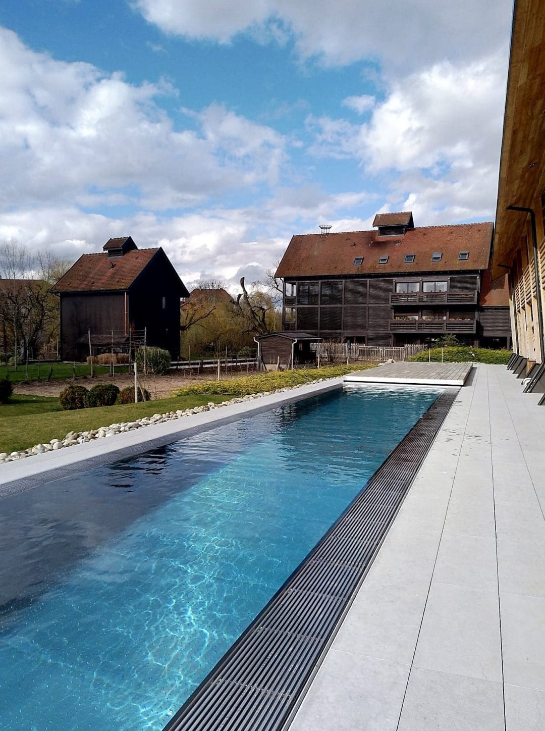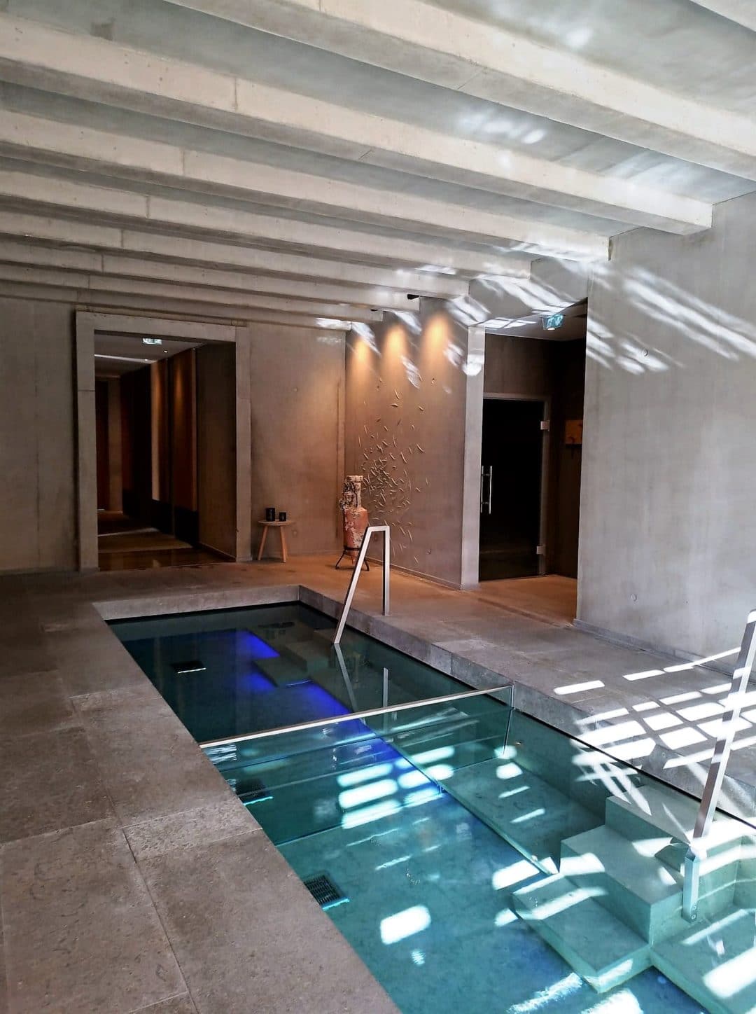 Et c’est sous les 7m² de charpente de grange revisitée en Spa, que viennent s’installer les 11 nouvelles chambres. C’est là, que je vais découvrir l’incroyable suite dans laquelle je vais séjourner ! Le spectacle architectural est incroyable. Cette grange contemporaine est constituée d’une charpente en chêne massif qui repose de façon asymétrique sur un socle de béton brut. Cette nouvelle extension nous propose 800 m² de Spa ainsi qu’une piscine extérieure chauffée… quand je vous parlais du Paradis !