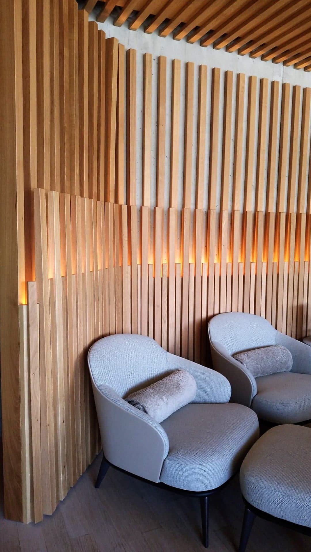 Après avoir profité de la tisanerie, on traverse un petit couloir qui dessert les 4 cabines de soins. Elles se dévoilent derrière de hauts pans coulissants en chêne, d’inspiration japonisante. Tout est fluide, facile pour aller à l’essentiel. Silence et détente pour ces cocons de bien-être…