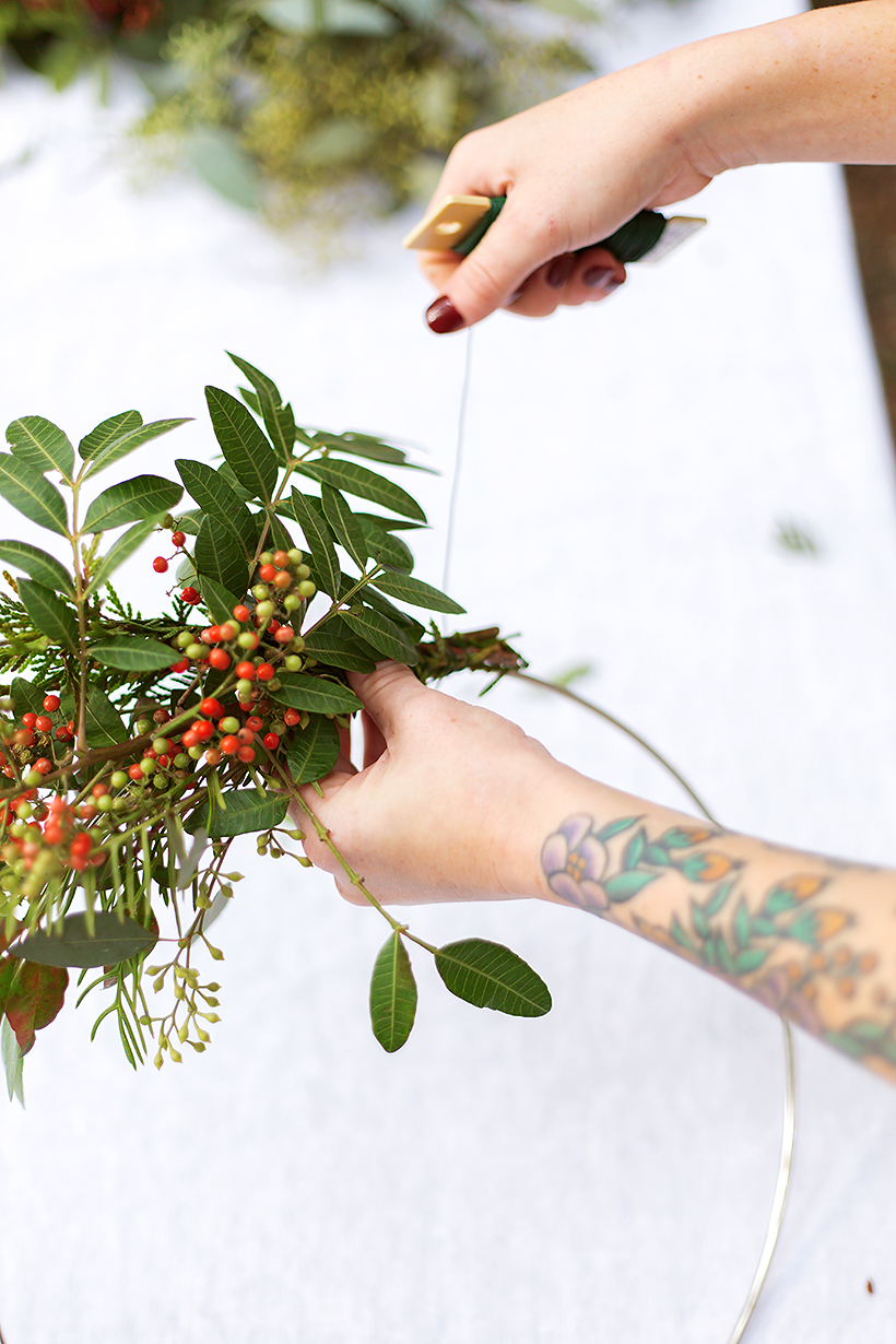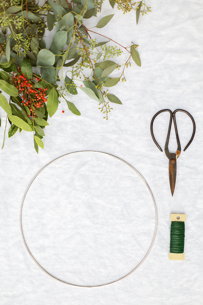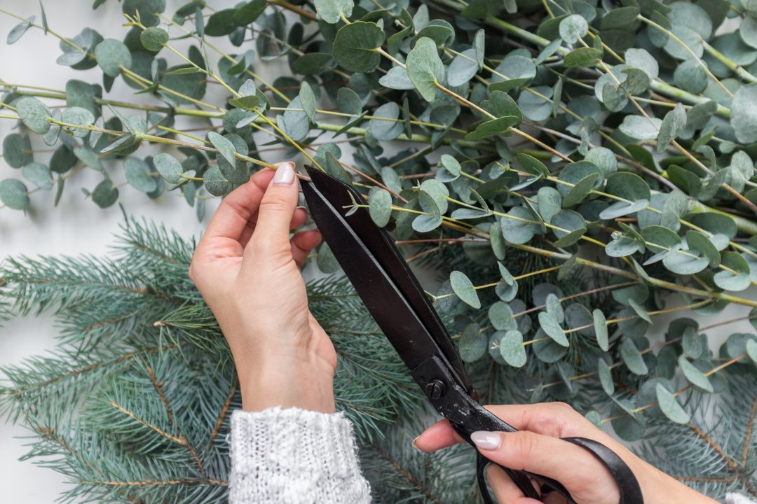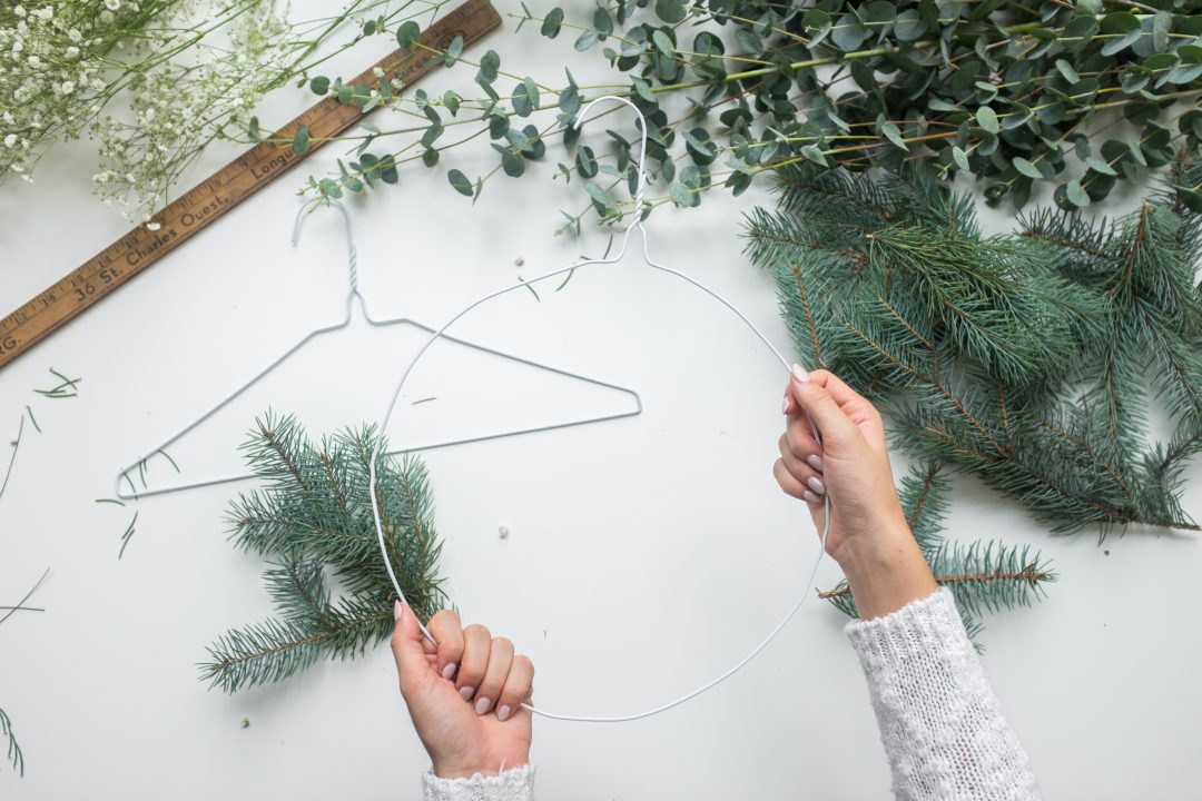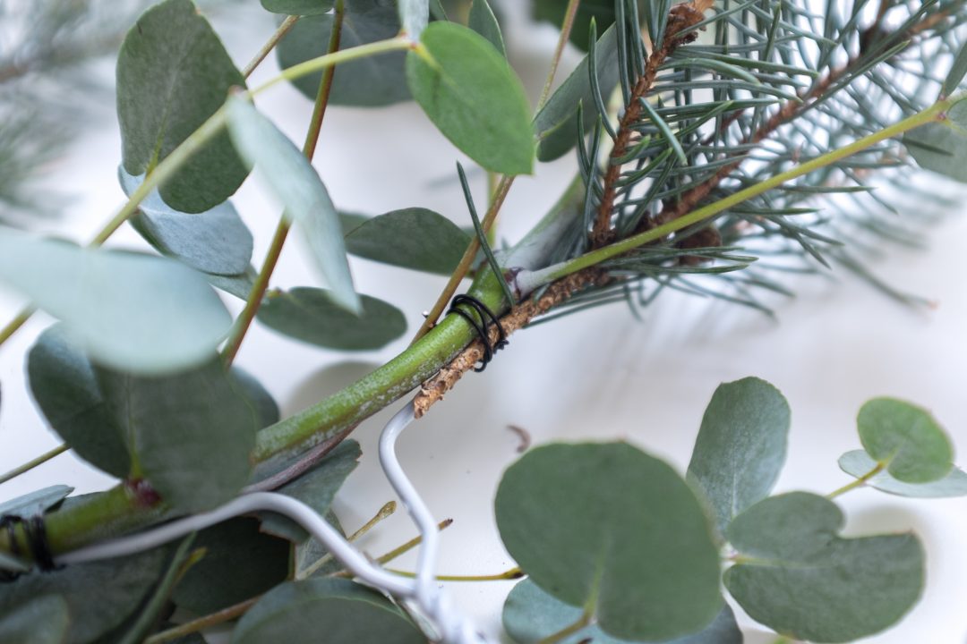 Aujourd’hui, place a la couronne Hand Made ! Pour ce faire j’ai choisi l’eucalyptus qui à pour symbolique la purification et les branches de sapin qui conjurent les mauvais sorts.
