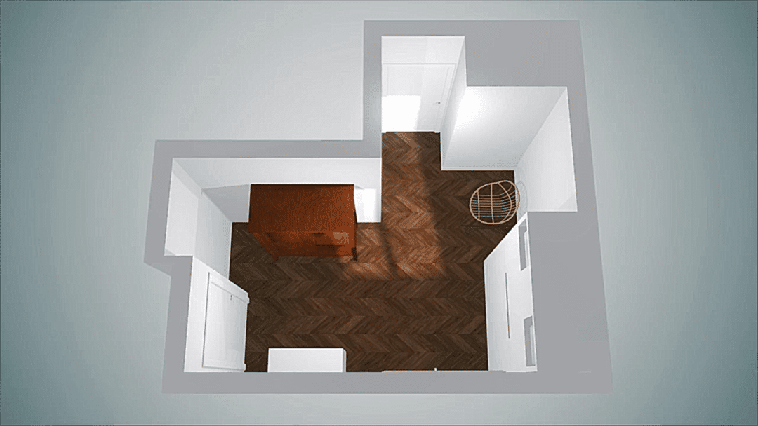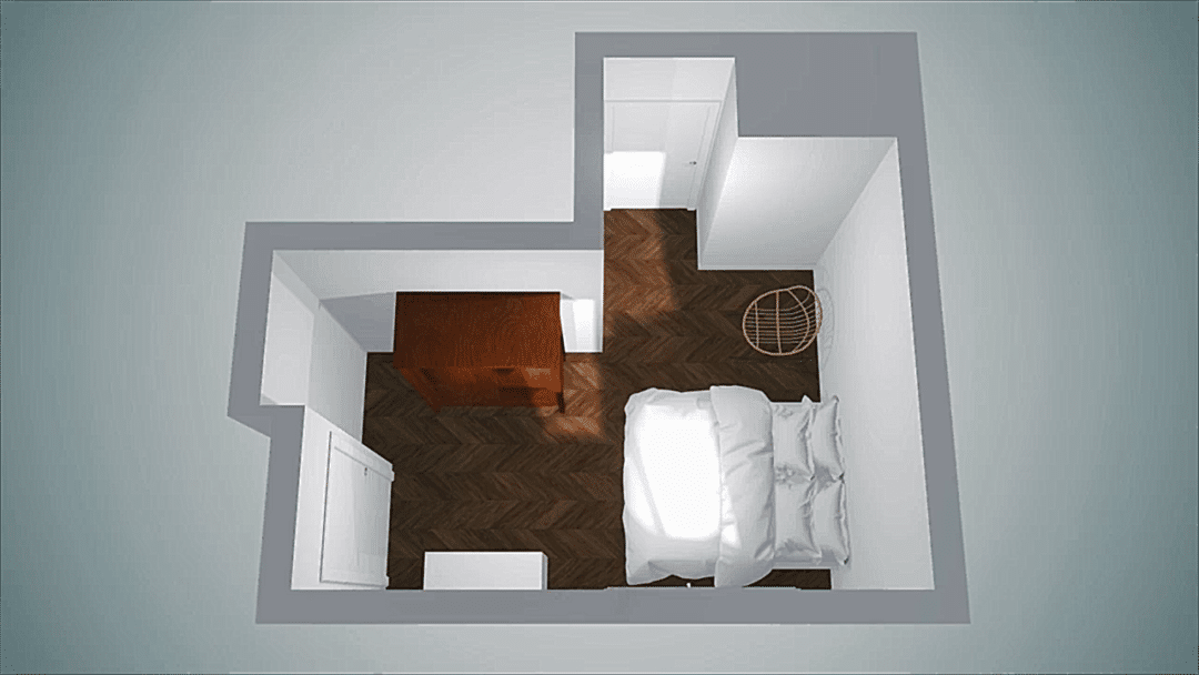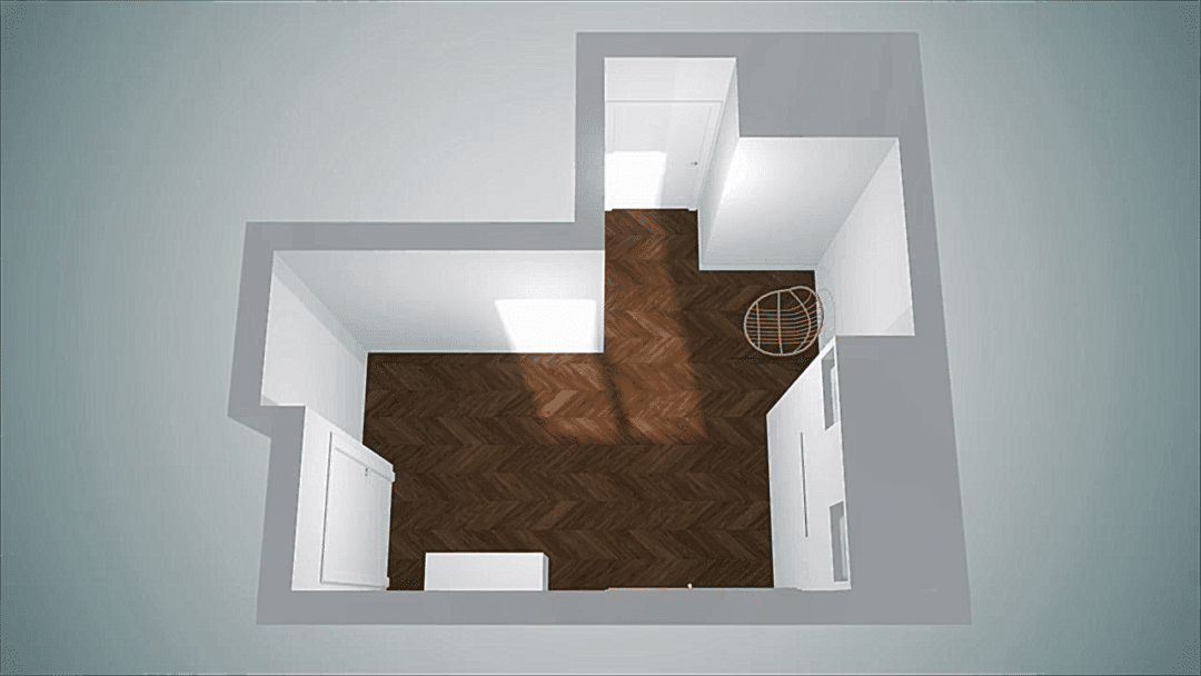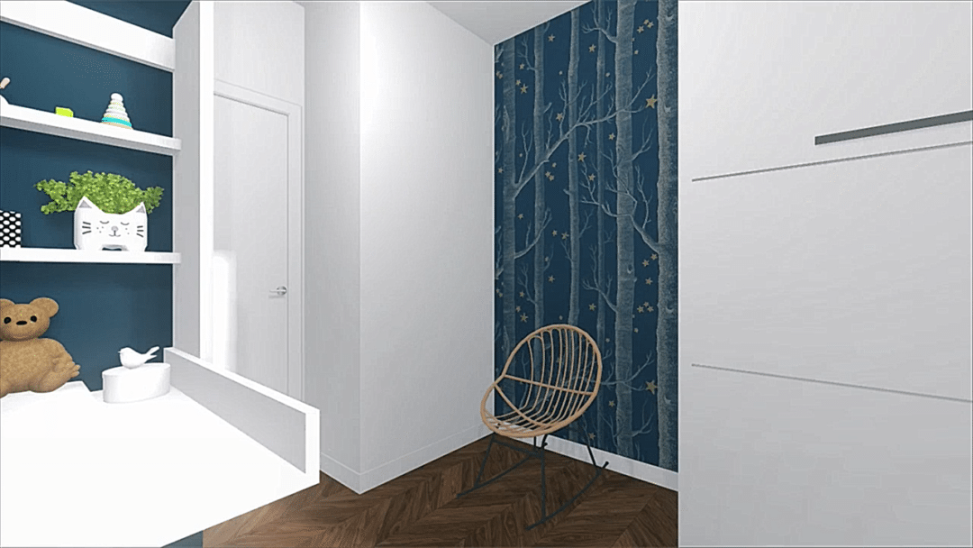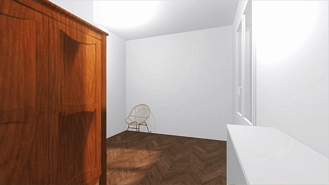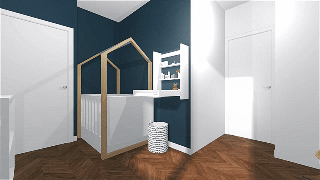 Enfin, je retire l’imposante Armoire d’Elodie afin de créer un espace propice au futur bébé. Ça ne se voit peut-être pas sur les 3D, mais à gauche de la chaise en rotin, c’est un placard intégré. Je ne supprime donc pas tout les rangements de la pièce. L’espace du bébé trouve naturellement sa place dans le renfoncement à côté de la salle d’eau.