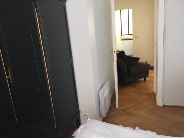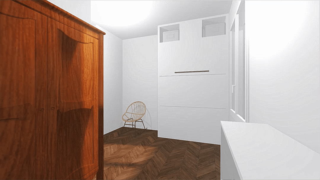 J’opte pour une solution simple et fonctionnelle en remplaçant le lit 2 places par un lit escamotable. Souvent oublié ou boudé, il est néanmoins l’objet idéal pour un gain de place garanti. Le lit escamotable à beaucoup évoluer au niveau de son design et là, clairement, c’était la seule solution pour remplir mon contrat avec Elodie. Une fois fermé, ce lit de 140 cm devient quasi invisible, et surtout, il libère l’accès à la terrasse et à la salle de bain.