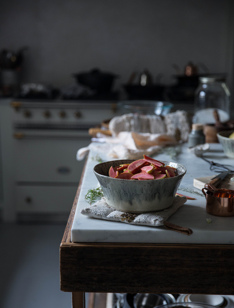 4-5 (environ 2 livres) de pommes roses de montagne, pommes de perles roses ou toute pomme ferme, coupée en demi-lunes⅛ « – ¼ » épaisse