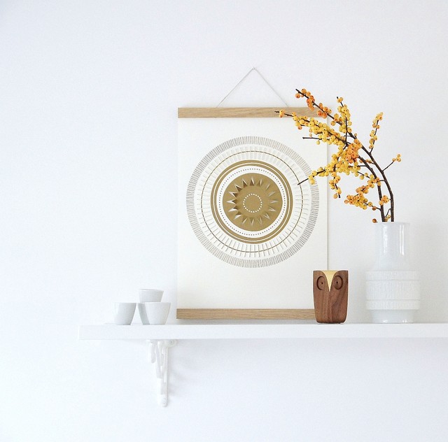 Je suis complètement tombé sous le charme du travail de Jurianne Matter et tout particulièrement sur The Sun Poster : Un grand soleil graphique avec des rayons de soleil découpés, imprimé à l’encre d’or métallique.