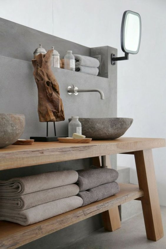 Maintenant que l’on a parlé technique, parlons déco. Sur le sol, les murs, sur le plan de travail, dans la douche ou encore en matériaux de base pour le lavabo, le béton apportera un côté naturel et authentique à votre pièce d’eau. Parfait pour un look industriel, la verrière lui sierra parfaitement au teint. Il se mariera idéalement au matériaux naturels, comme le rotin pour un esprit vintage, au bois brut pour un style scandinave et accueillera parfaitement les lignes design d’une salle de bain contemporaine.