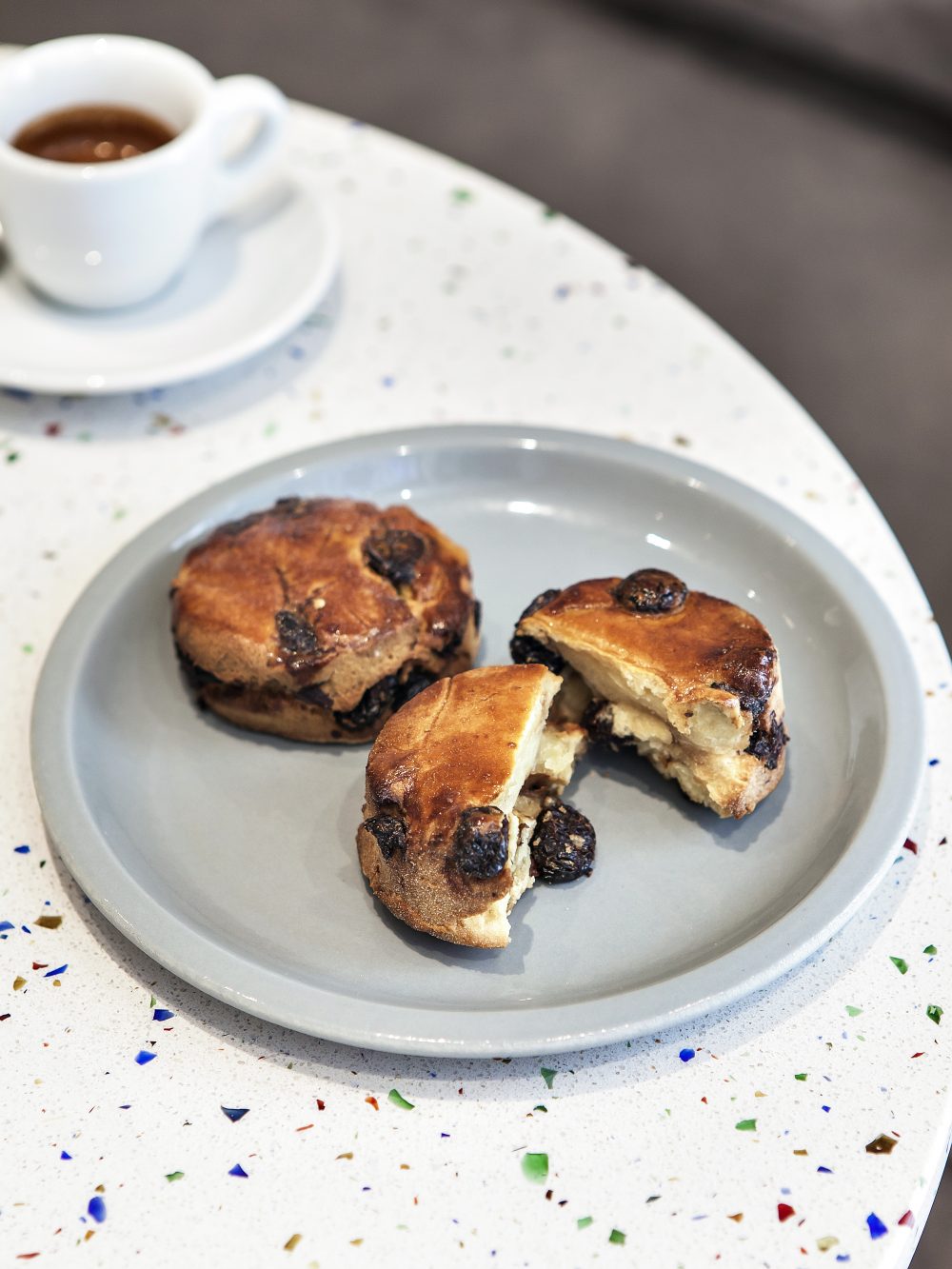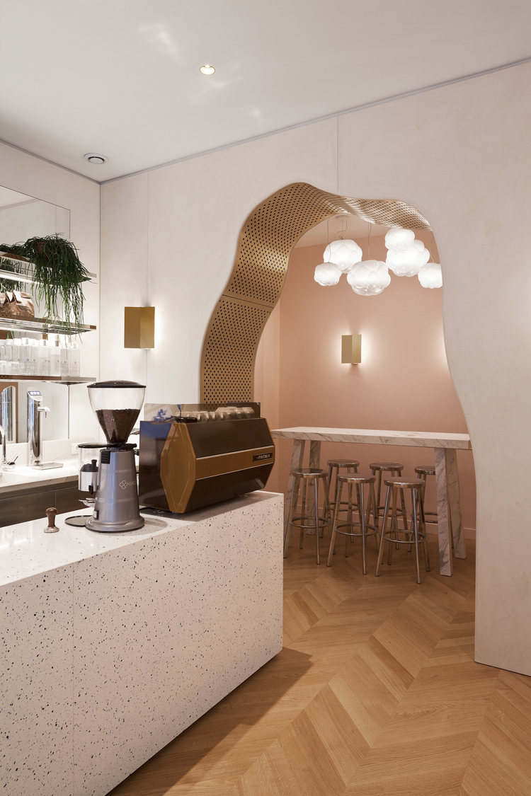Les hauts plafonds, les murs blancs finement striés et le petit salon rose poudré ont été conçus pour accueillir chaleureusement les visiteurs, et qu’ils se sentent comme à la maison. On aime tout particulièrement le comptoir, ainsi que les tables style bistrot, recouverts de terrazzo !