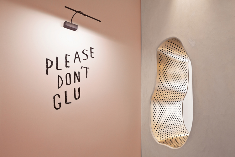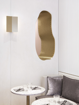 La vraie bonne idée de cet espace, c’est certainement ces ouvertures aléatoires et ondulées, recouvertes d’une fine lame de laiton perforé. Le laiton est l’un des matériaux que l’on retrouve par petites touches sur les luminaires et qui révèle toute l’élégance du lieu.