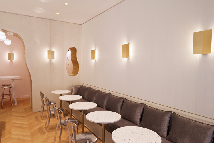 Imaginé par Mathieu Lehanneur, la petite surface du restaurant et son take away est un véritable écrin de douceur et de poésie. Le designer a utilisé des matériaux naturels et nobles tels que le marbre et le quartz, suggérant la pureté des lignes et des formes. Le mobilier presque tactile, doux, ainsi que les banquettes en velours gris pale, ajoutent un sentiment de confort absolu et de sérénité !