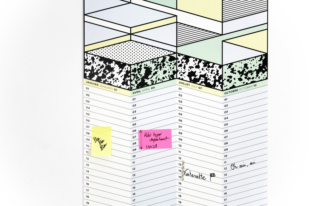 La collection se compose de papiers peints de lés de 3 à 10 mètres avec raccords, un calendrier perpétuel et une toise ! On adore l’idée :D