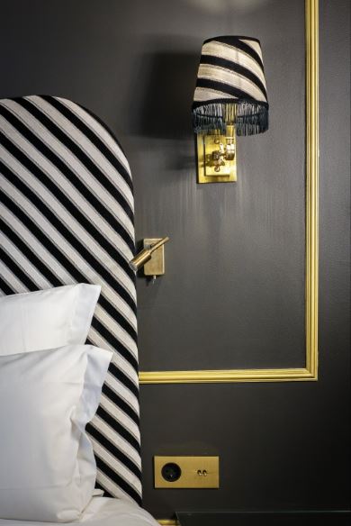 C’est parti pour une petite visite au 2ème étage, où je rencontre « La mondaine », « L’impertinente » et « La silencieuse ». Toutes splendides ! Elles sont à la fois sophistiquées (du marbre dans la salle de bains et du laiton partout), simples (peu de couleur, on mise sur le noir et blanc), originales (de la moquette pied de poule ! ) et terriblement chics. La déco est toujours pimpée par des pièces très contemporaines, évitant ainsi le total look.
