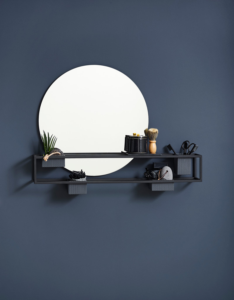 Conçu par la designer Laura Bilde pour notre marque chouchou Woud, Mirror Box est composé d’un miroir rond reposant sur une structure en acier noir dans laquelle se trouvent quatre petites boites de rangement en acier perforé et une plaque de marbre noir. Choisissez votre composition ! Les boîtes de rangement et la plaque de marbre peuvent être déplacées selon vos besoins et vos envies.