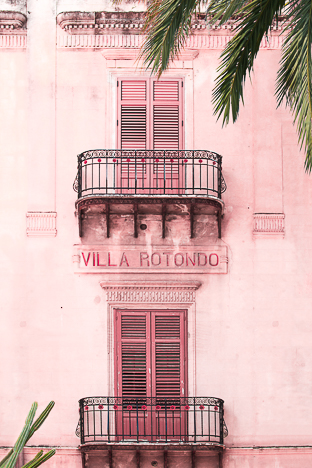 Les fenêtres de la Villa Rotondo en Italie. Avec ses murs roses et ses feuilles de palmiers, cette photographie d’architecture nous fait voyager dans le sud sans bouger.