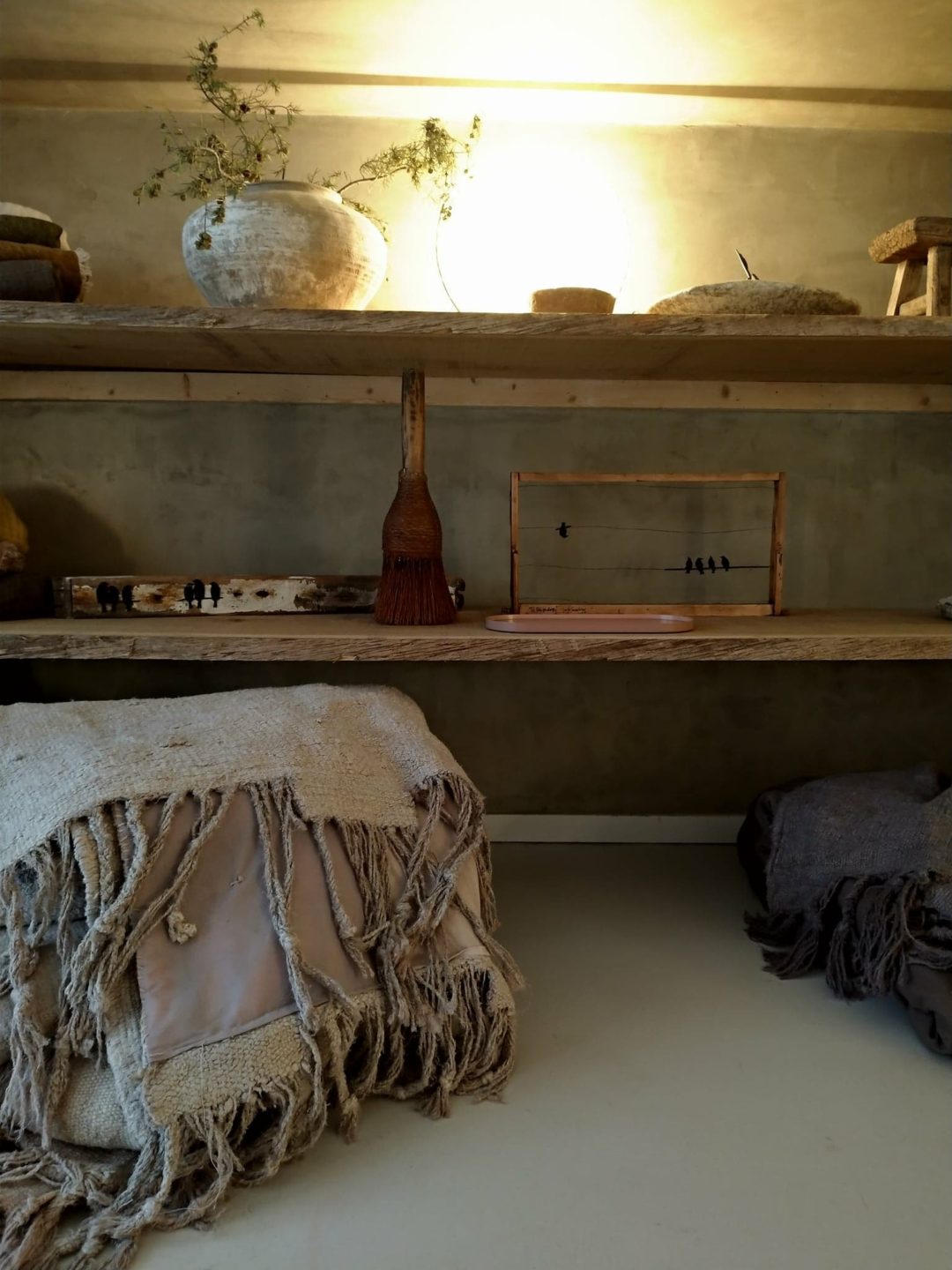 Tapis, coussins, plaids, canapés… En plus de son linge traditionnel, exposé dans une impressionnante bibliothèque de plus de 250 références, Maison de Vacances propose du mobilier vintage et des objets déco chinés au court des voyages du couple à travers le monde.