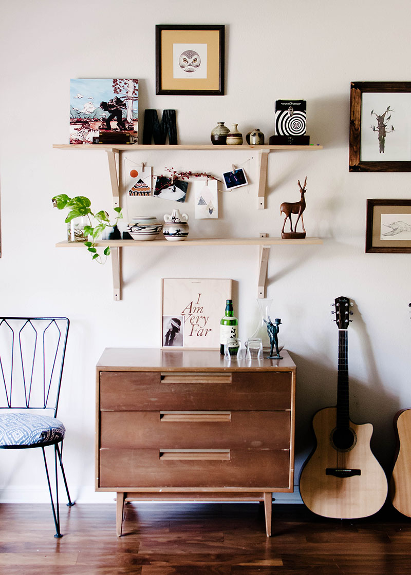 Côté bureau, j’ai déplié une chaise vintage sur laquelle je pose mes dossiers. C’est une façon de les avoir près de moi sans encombrer visuellement l’espace. Et j’ai aussi sorti la guitare de son étui, posée sur un coin de mur. Une mise en scène qui ne coûte rien et qui change tout ! Car comme le rappelle Charlotte Vannier dans son livre, ce sont quelques détails qui font la différence.