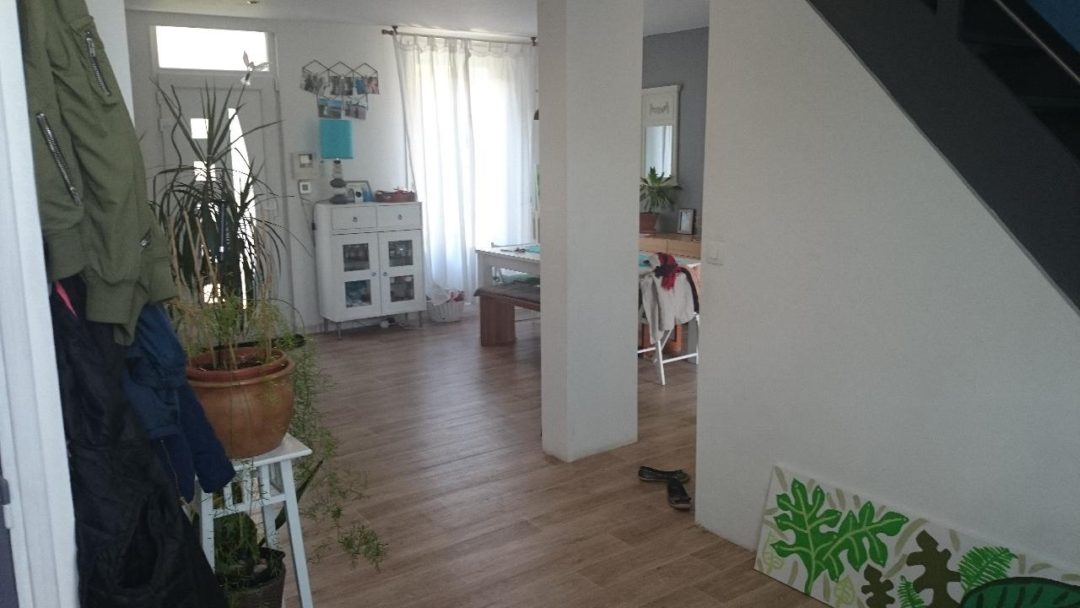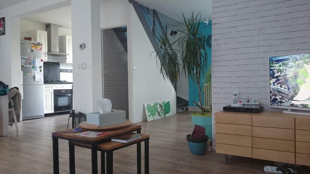 Après avoir effectué des travaux et cassé quelques murs au rez-de-chaussée de sa maison, Muriel était satisfaite de l’ouverture des espaces et de la luminosité. Mais comme souvent, une fois que l’on dispose d’un si grand espace, on ne sait pas toujours quoi en faire ! Cette pièce réunit aujourd’hui plusieurs fonctions : entrée, cuisine, salle à manger, salon et bureau. C’est beaucoup ! Et comme Muriel me l’a expliqué, elle souhaitait conserver ce beau volume, tout en délimitant subtilement les différents espaces.