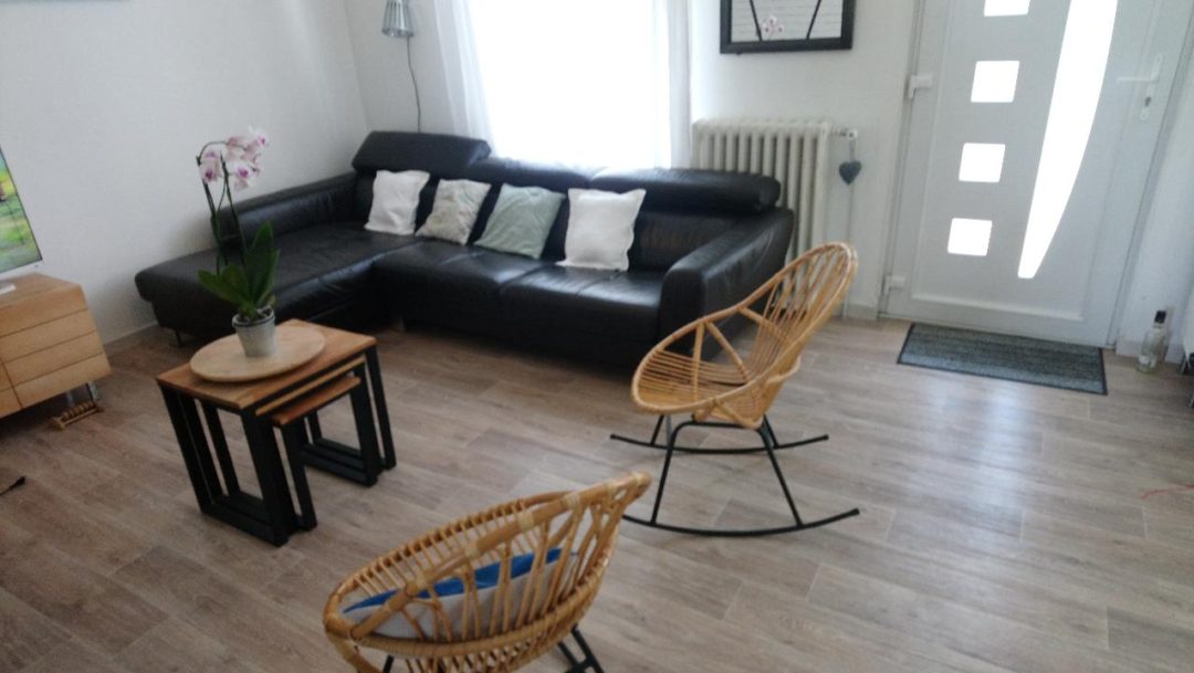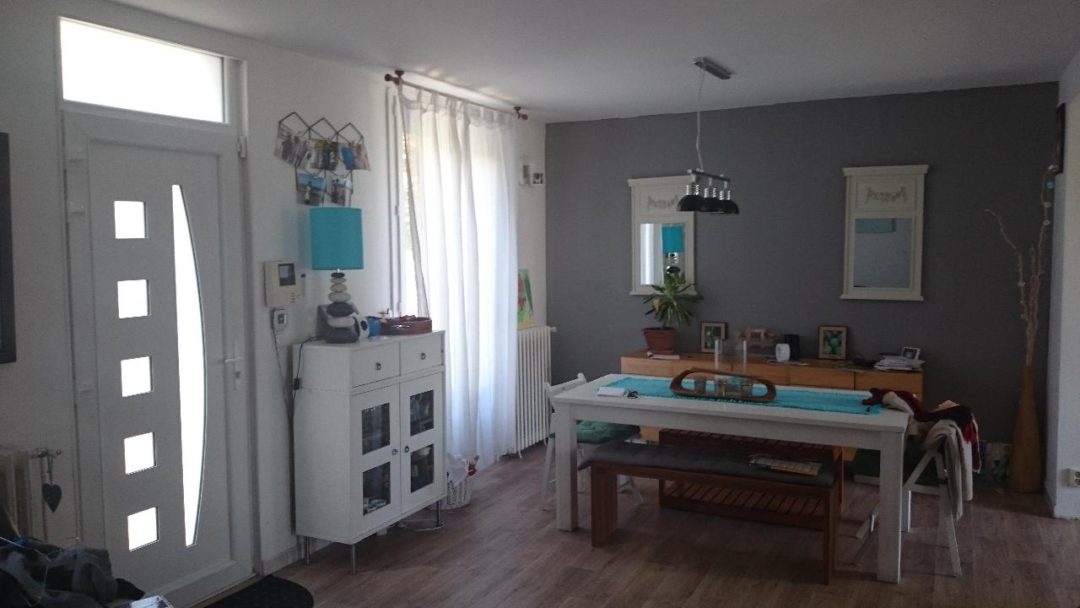 Selon moi, Muriel a opté pour une bonne disposition de son mobilier. La salle à manger se trouve en face de la cuisine, le salon en parallèle et le coin bureau un peu en retrait. Nous avions donc une bonne base et il me semblait judicieux de la conserver ;)