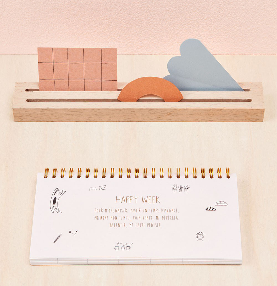 On reconnait d’un côté la douceur, la féminité et la légèreté des deux sœurs à l’origine de l’enseigne Des Petits Hauts, et de l’autre, le mobilier design et les matériaux naturels qui font le charme d’Hartô. Le résultat ? Une collaboration déco à la fois fraîche et poétique qui nous fait rêver. On y retrouve tout d’abord une délicate ligne de papeterie dans des coloris pastel et des graphismes légers : des bloc-notes coloris blush, des règles en bois et des pots à paillettes, des petits carnets pleins de fraicheur, un maxi calendrier et des gomettes à coller partout !