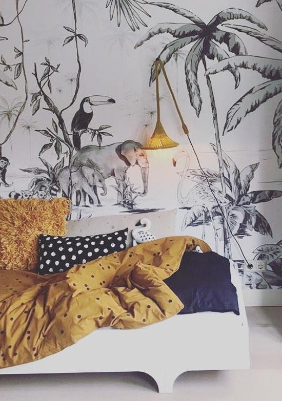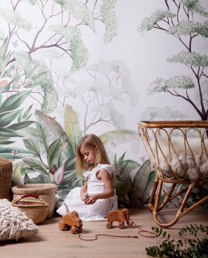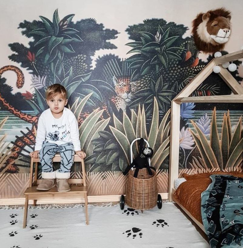 Mon coup de cœur va à ce magnifique papier peint repéré chez Photowall et designé par Lemon, un studio de design multidisciplinaire sud-africain. Il pourrait bien évidemment sublimer d’autres pièces de la maison, mais dans une chambre d’enfant, je le trouve généreux et encore plus vivant lorsqu’il se passe des choses devant lui. En simple aplat, par exemple dans un couloir, je l’aime beaucoup moins !