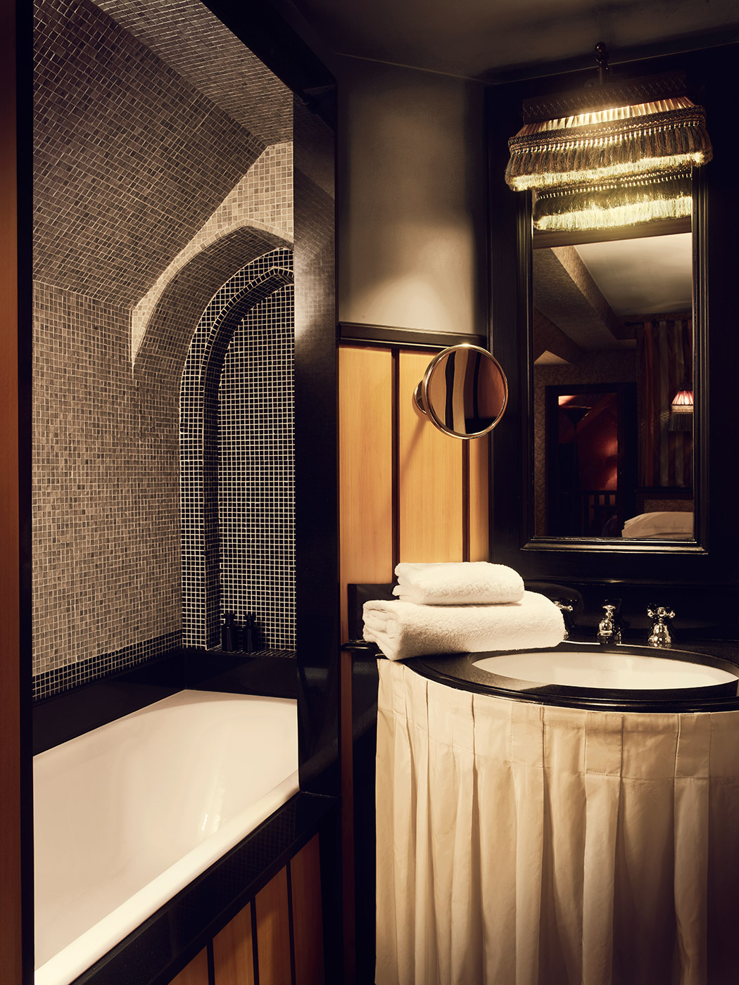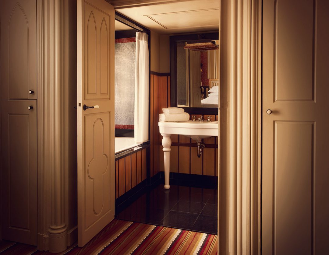 Même étroites, les chambres offrent une déco sophistiquée et chargée. Chaque meuble est dessiné sur mesure par Jacques Garcia. Ainsi, les guéridons, tables et têtes de lit s’emboîtent parfaitement dans cette précieuse maison de poupée. « J’ai trouvé intéressant de montrer que ce qui est petit peut devenir grand » indique-t-il. Au Bourg Tibourg, la contrainte fait donc la richesse.