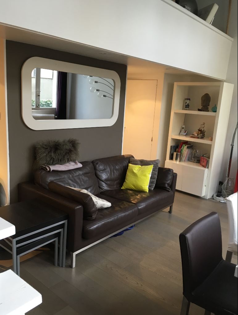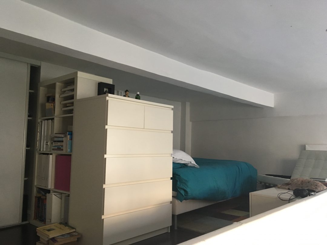 J’ai commencé par fermer la mezzanine avec une verrière, dans le soucis de bien distinguer les différentes pièces de l’appartement. J’ai séparé la pièce du haut en deux et créé un placard sur mesure sur toute la longueur de la mezzanine: une partie pour les vêlements et une partie pour les dossiers et les archives de Ruth.