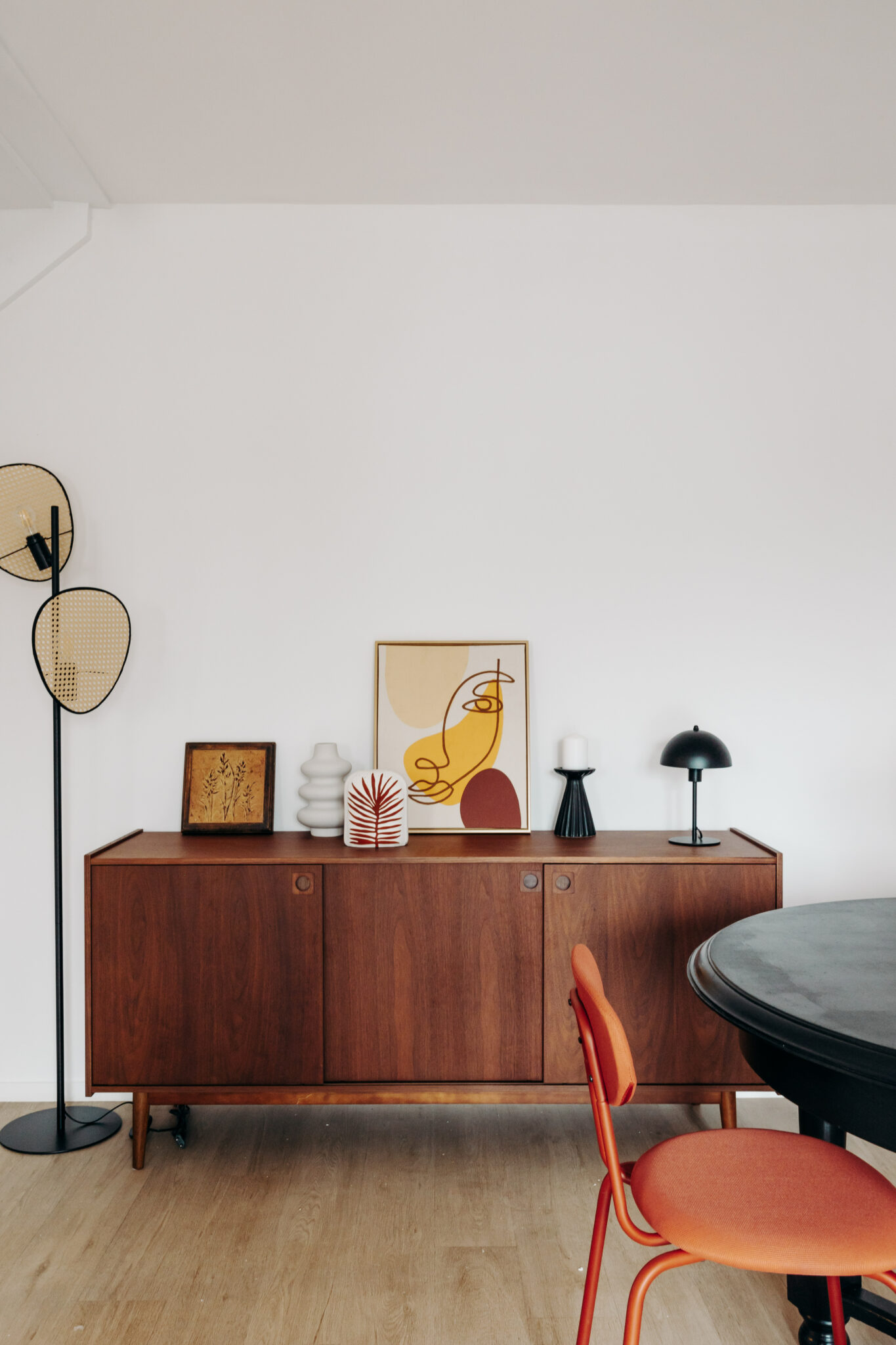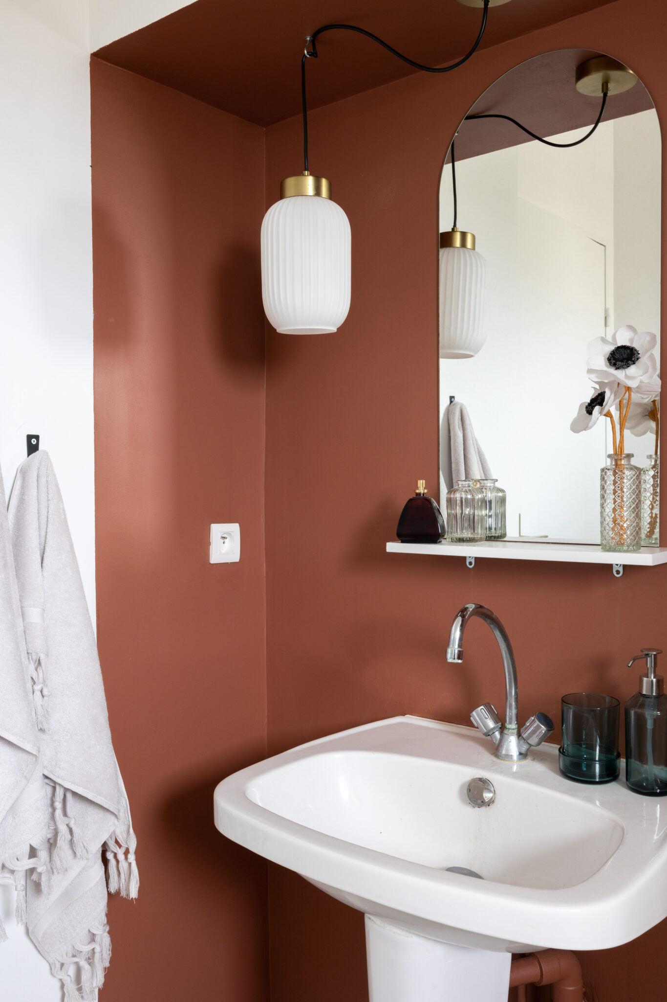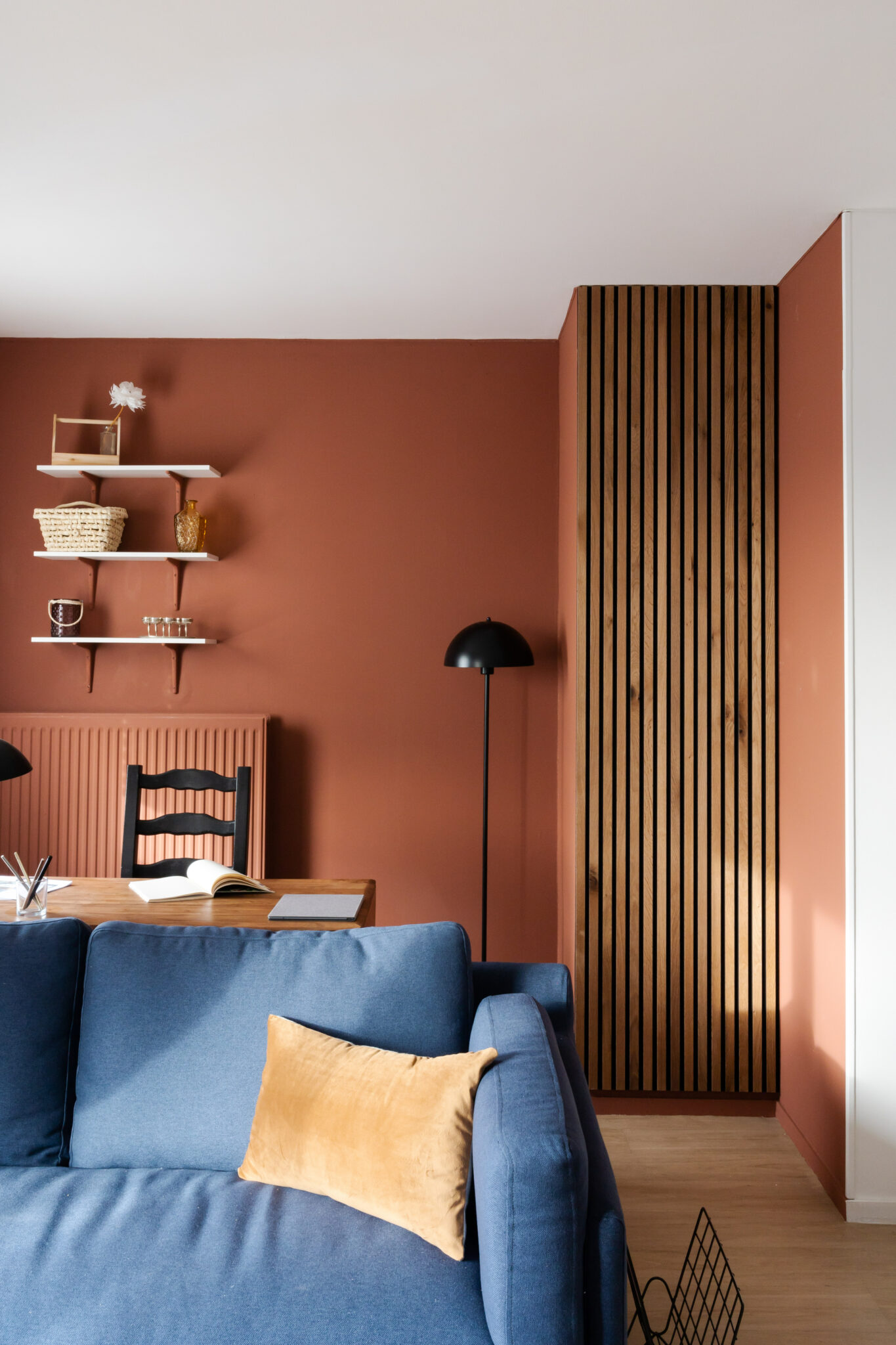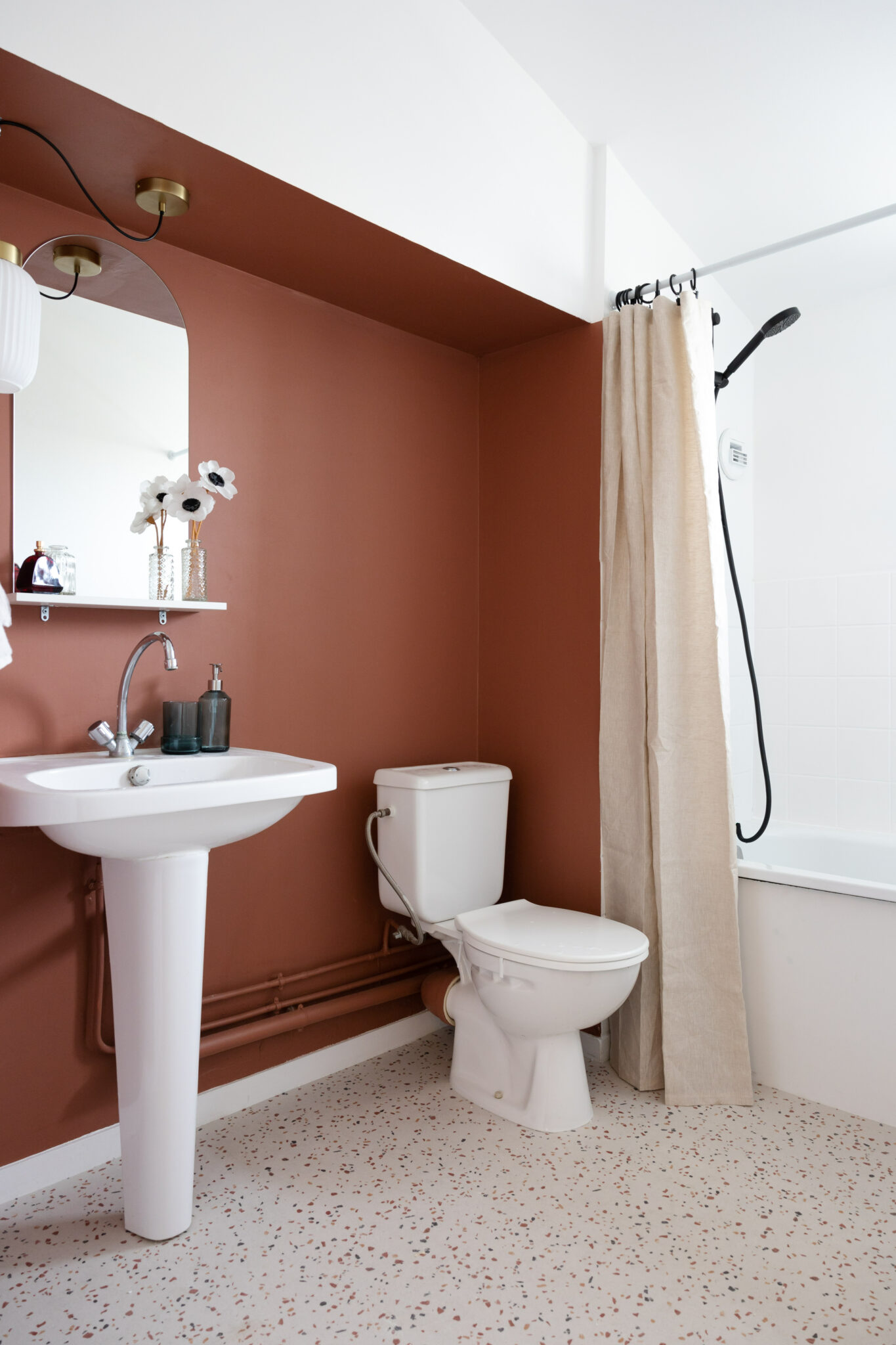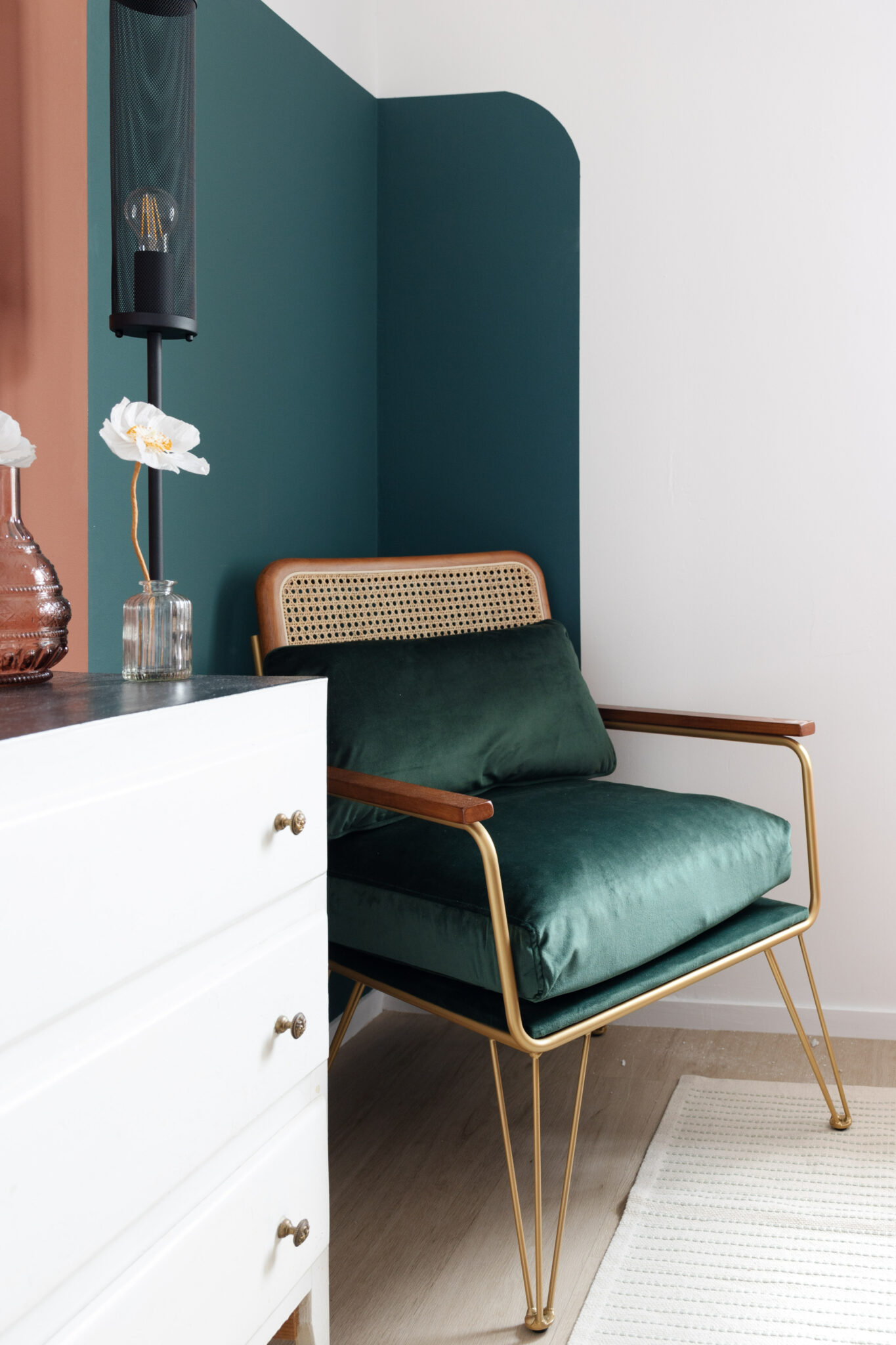 Peinture : Unikalo – Canapé : Camif – Meuble télé : Maison du Monde – Chaises terracotta : Ikea – Luminaires : Corep – Revêtement sol : Gerflor – Fleurs en papier : Miluccia – Linge de lit : Blanc Cerise – Fauteuil chambre : Maison du Monde