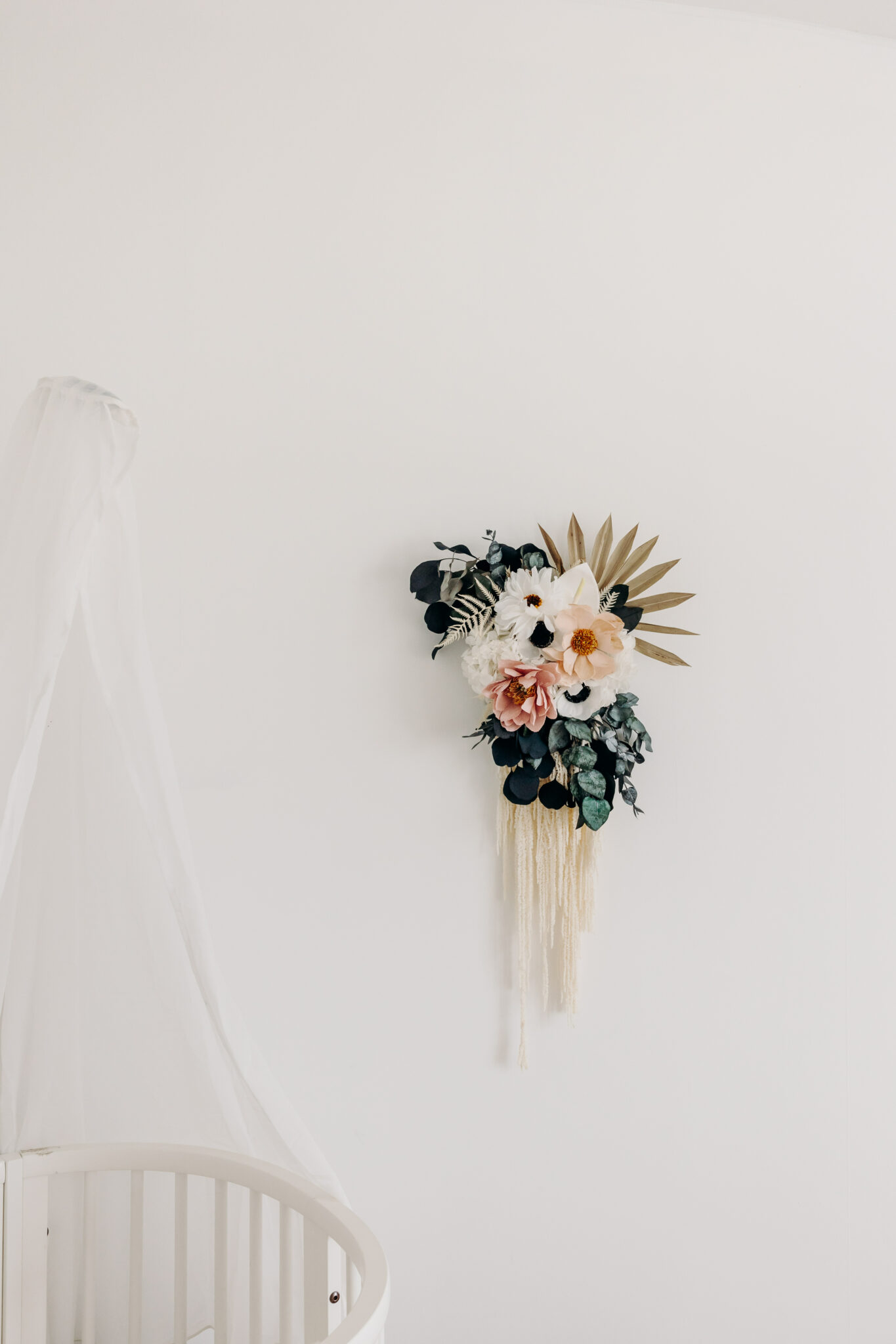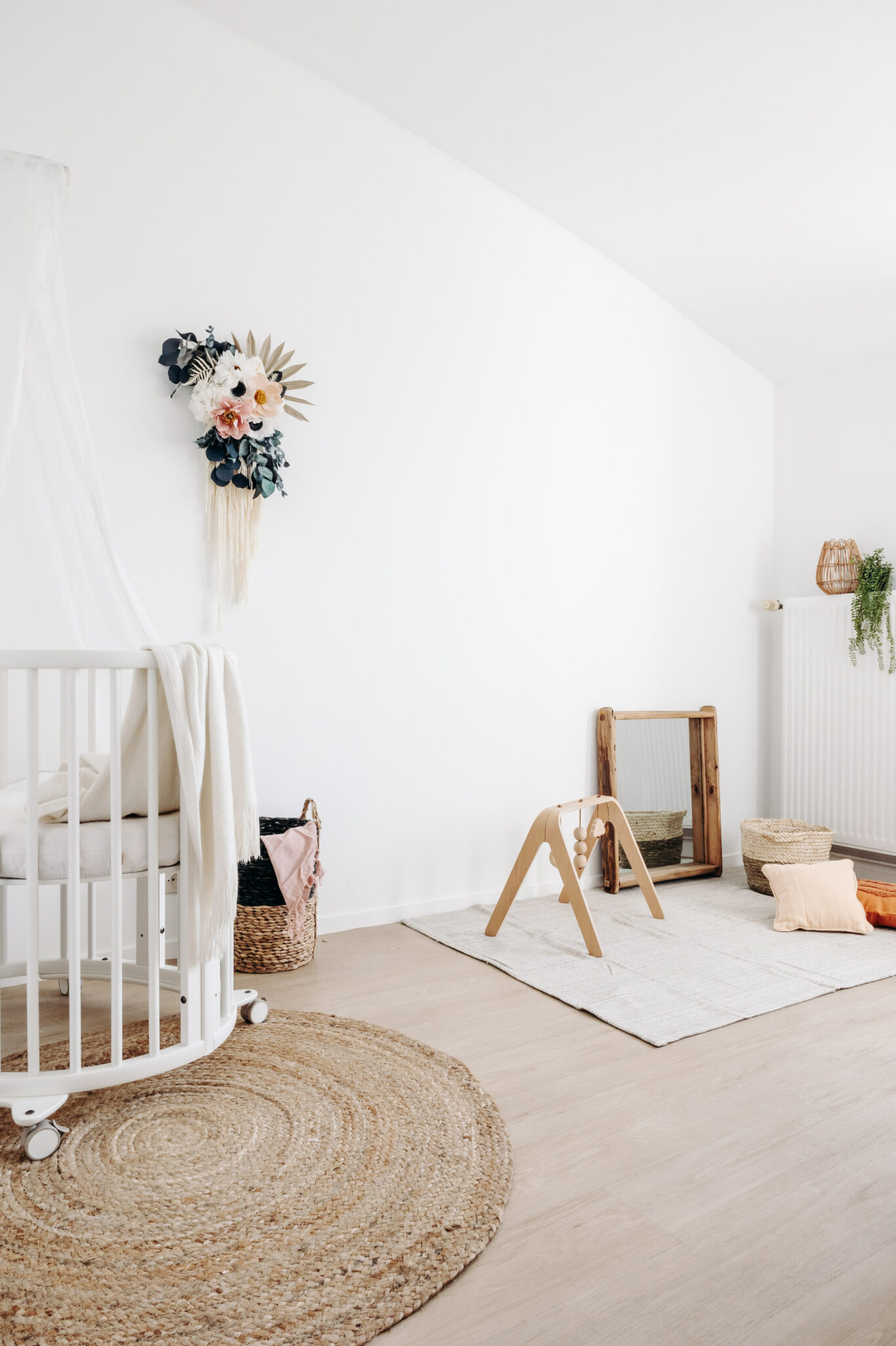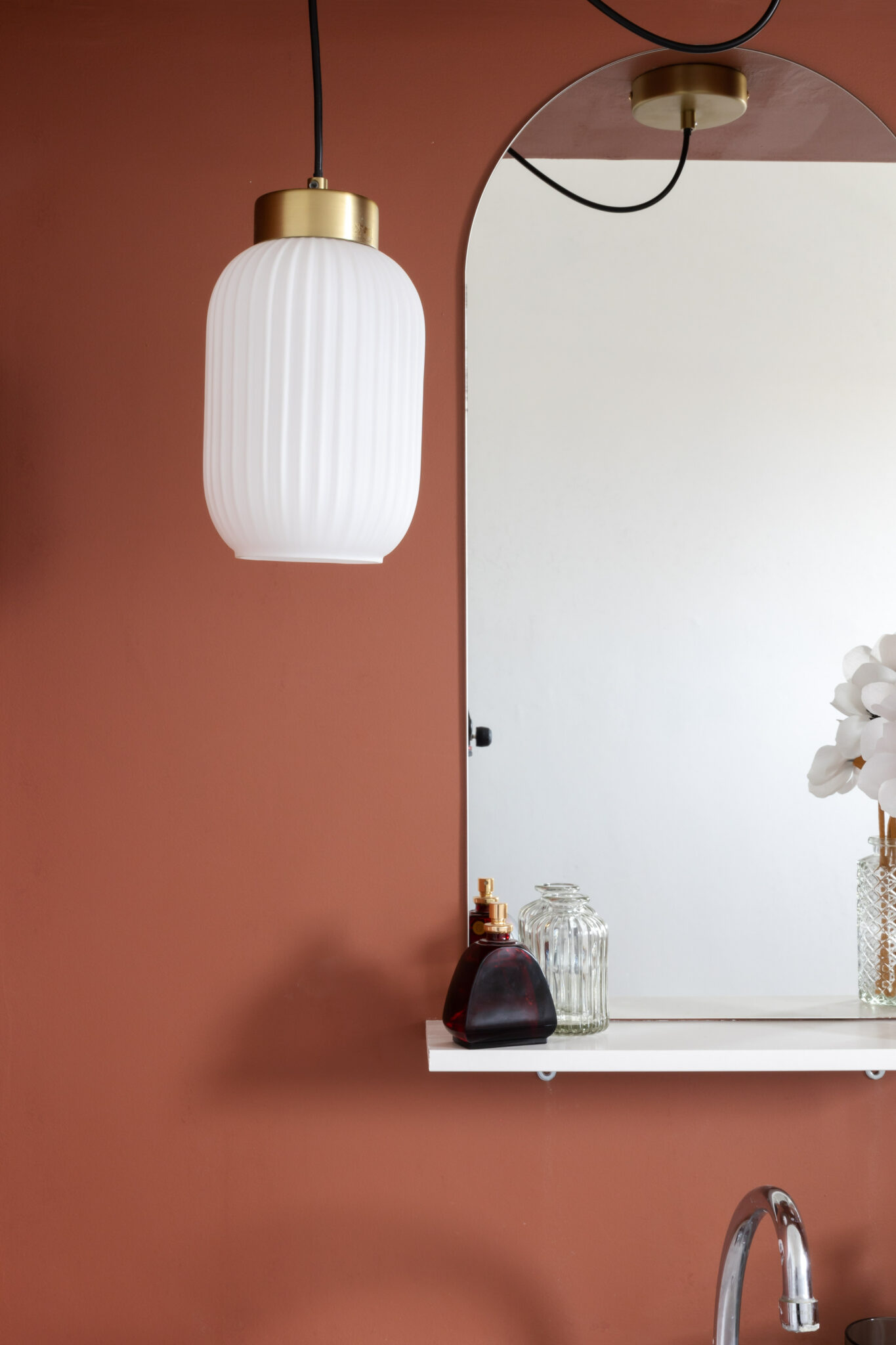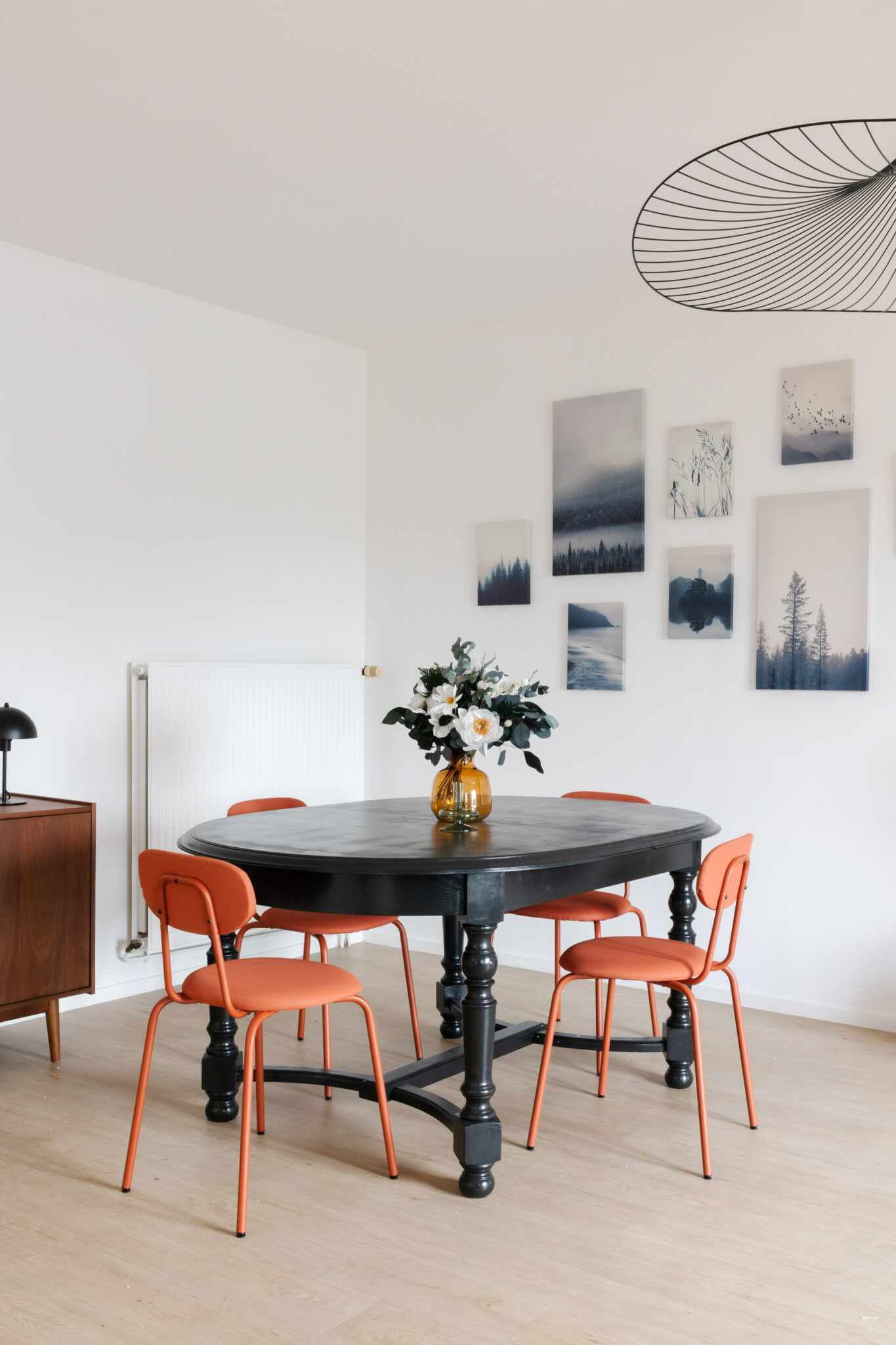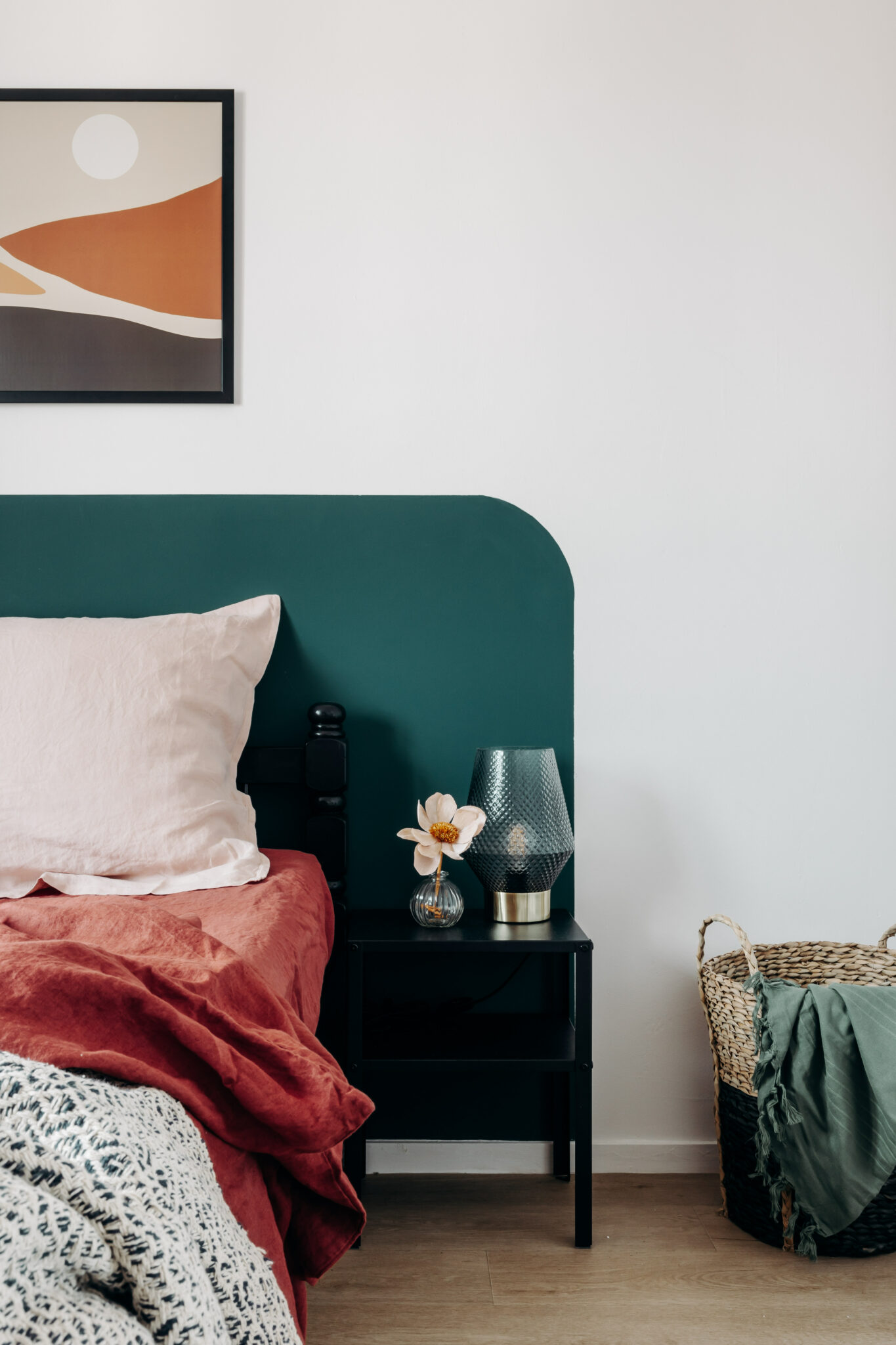 Peinture : Unikalo – Canapé : Camif – Meuble télé : Maison du Monde – Chaises terracotta : Ikea – Luminaires : Corep – Revêtement sol : Gerflor – Fleurs en papier : Miluccia – Linge de lit : Blanc Cerise – Fauteuil chambre : Maison du Monde