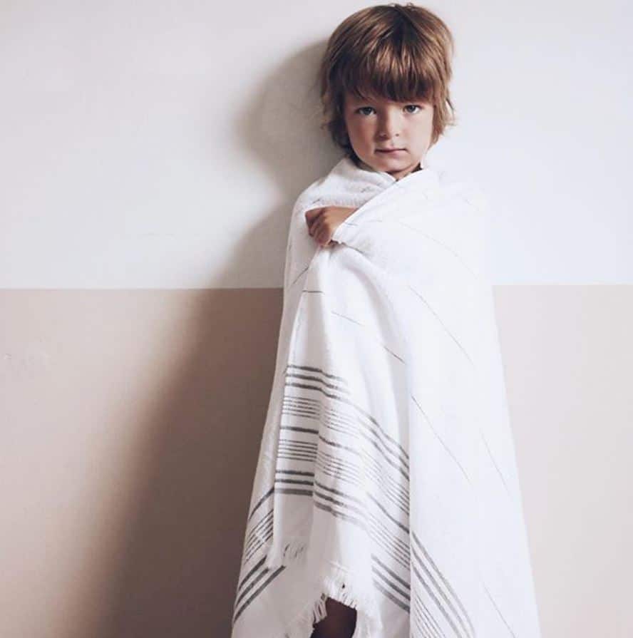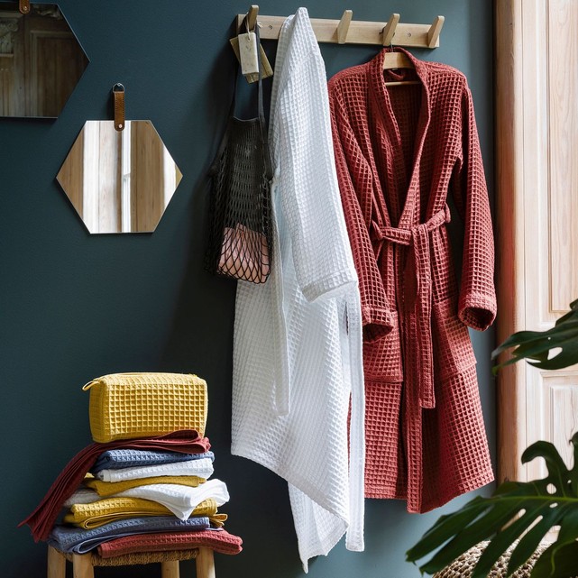 Enfin pensez peignoirs et serviettes de bain. Jouez avec les matériaux et les couleurs. Personnellement je suis assez fan des serviettes esprit foutas, j’ai l’impression d’être dans un hammam. Le linge de maison nid d’abeille ne me laisse pas non plus indifférente.