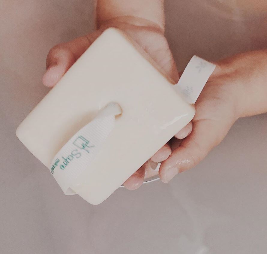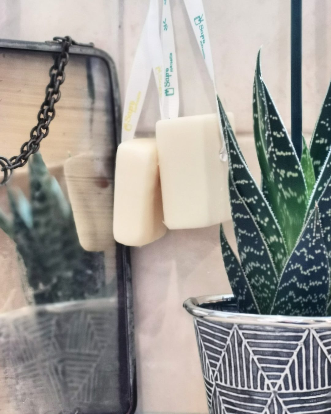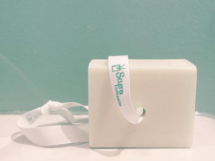 Beau et malin : le petit + qui change tout : un joli ruban qui permet une prise en main facile du cube de savon, et sa suspension après usage pour le garder au sec.