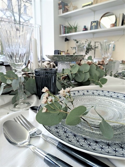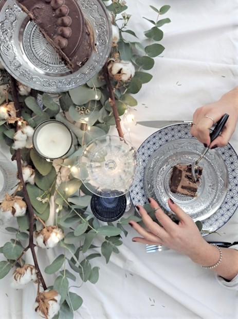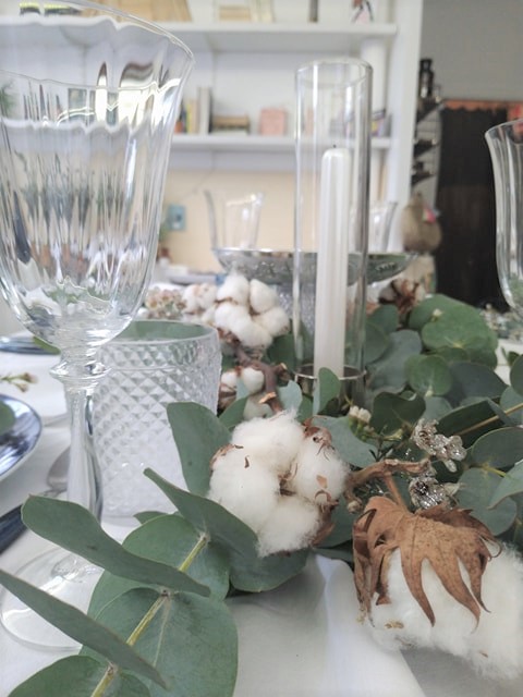 Et pour décontracter davantage l’ambiance, un centre de table esprit bohème et nature. Eucalyptus, coton et quelques petites fleurs blanches pailletées, c’est la fête quand même, à ne pas oublier !