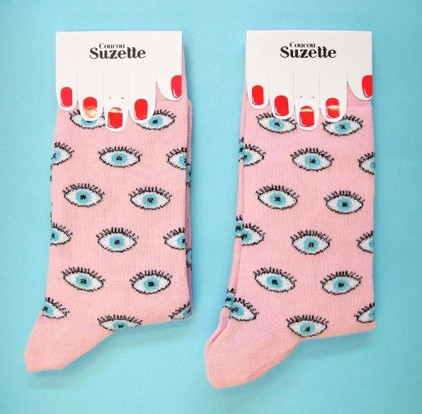Puis vient celui de Coucou Suzette, qui affiche une série d’yeux pop et colorés sur des accessoires ultra kitsch. Un vrai coup de cœur ! Si le pin’s « œil » est un best-seller, je préfère les chaussettes roses aux yeux bleus, car qui peut résister aux yeux bleus ?!