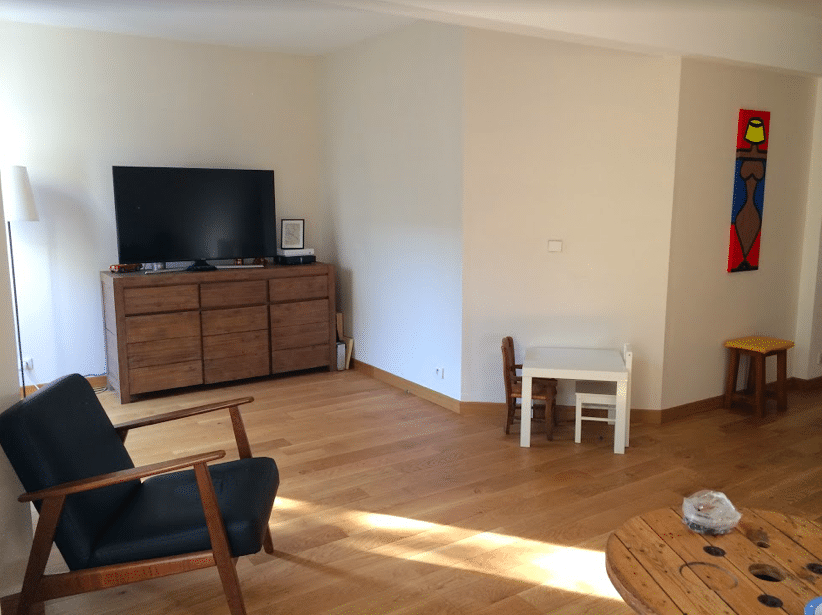 Comme vous pouvez voir sur les photos de chez Sabrina, la télévision à été placé dans le L du séjour. Elle occupe aujourd’hui une pièce à elle seule et surtout, elle est placée à plus de 5 mètres du canapé… Afin de créer un nouvel espace salle à manger et de retrouver le fonctionnalité du salon, j’ai placé la télé dans l’angle du L.